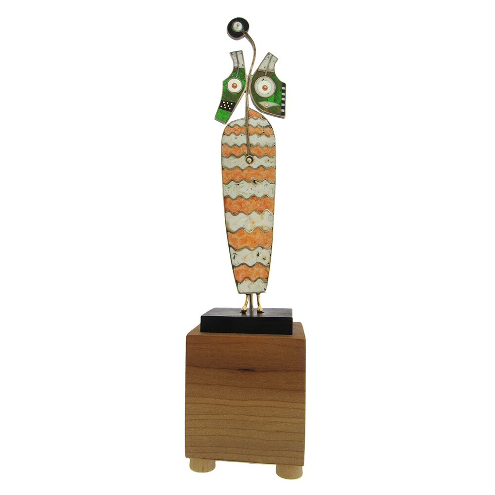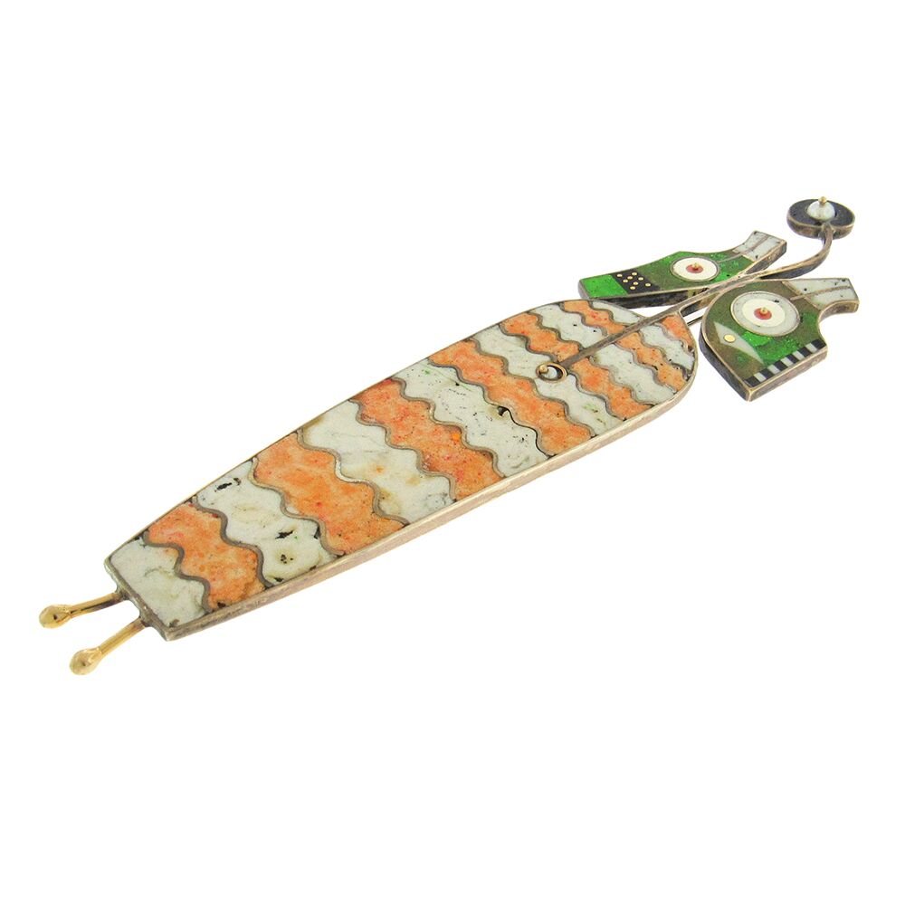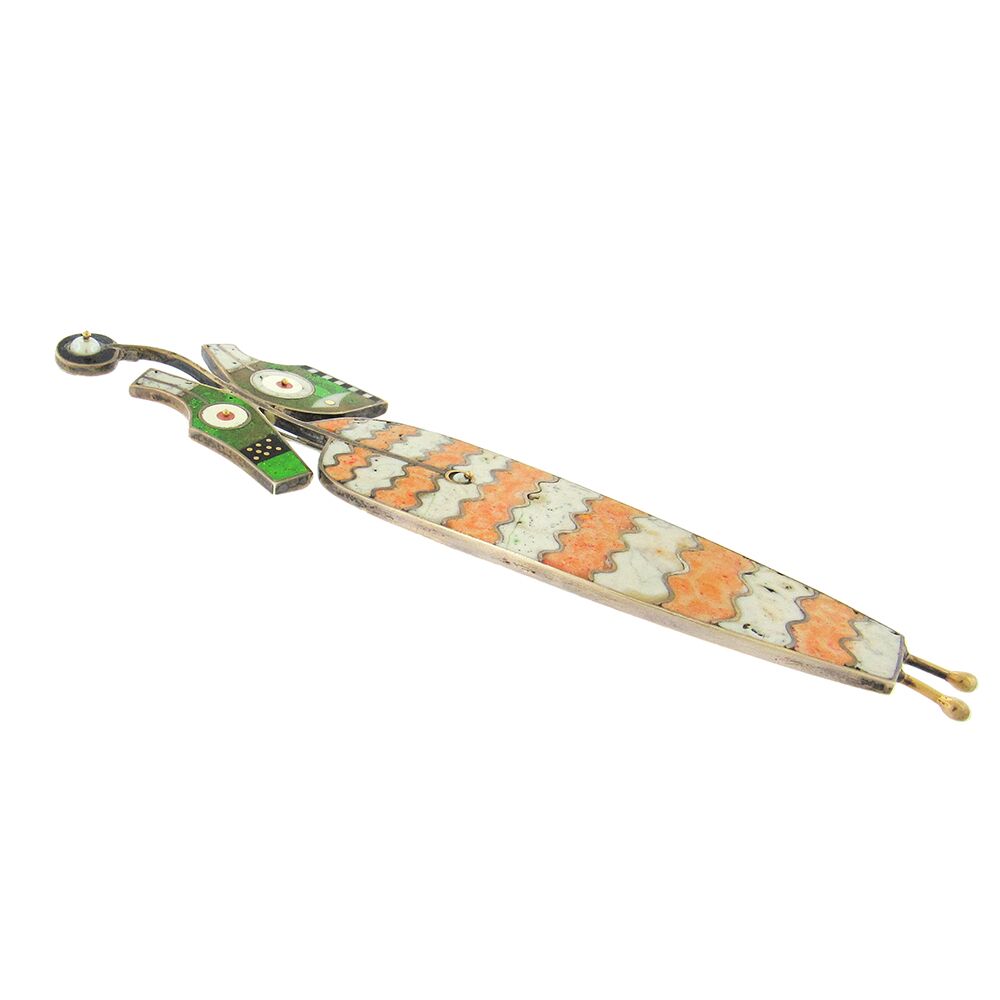 One of Tod Pardon’s most delightful sculpture/brooches, ‘Miladie’ dates from 2000 and is beautifully crafted in resin, bone, sterling silver, wood, 14K gold and pearl. The brooch, from a private owner, measures 1-1/2″ x 6-1/2″. Accompanied by original stand, 2-1/4″ x 2-1/4″ x 1-1/2″ high