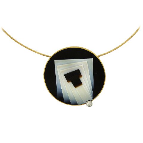 Tom Munsteiner’s newest collection, a modernist update on the traditional layered agates used for cameos and intaglios, is bold and nuanced. Here, a circular black and white agate in a layered geometric design is set in 18K gold with a 0.25 ct diamond. The pendant is 2″ in diameter, 18K 18″ gold coil necklace included, and note the meticulous design and craftsmanship of the 18K bezel that edges along with the stepped layers where needed.