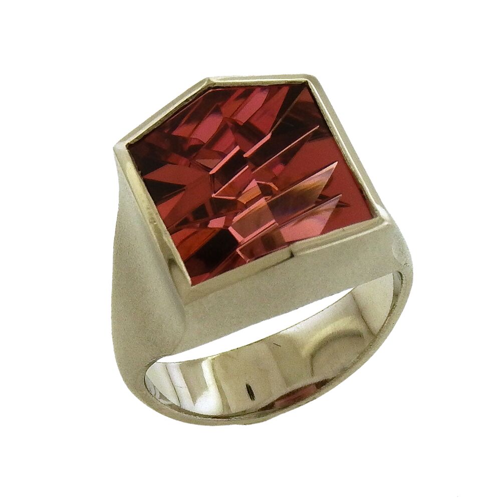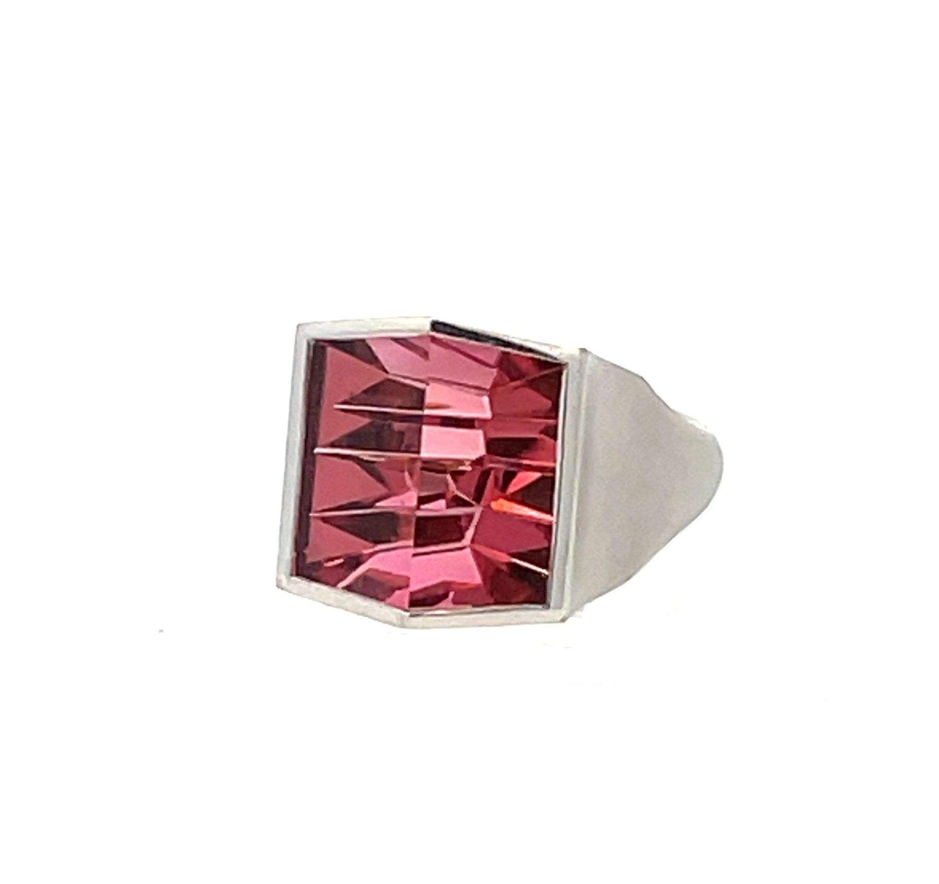 Tom Munsteiner’s deep pink square gem tourmaline, 7.32 carats, is incised below and beveled in two facets on top, set in platinum. The ring measures 1/2″ square x 3/8″ above the hand and is size 6.5.