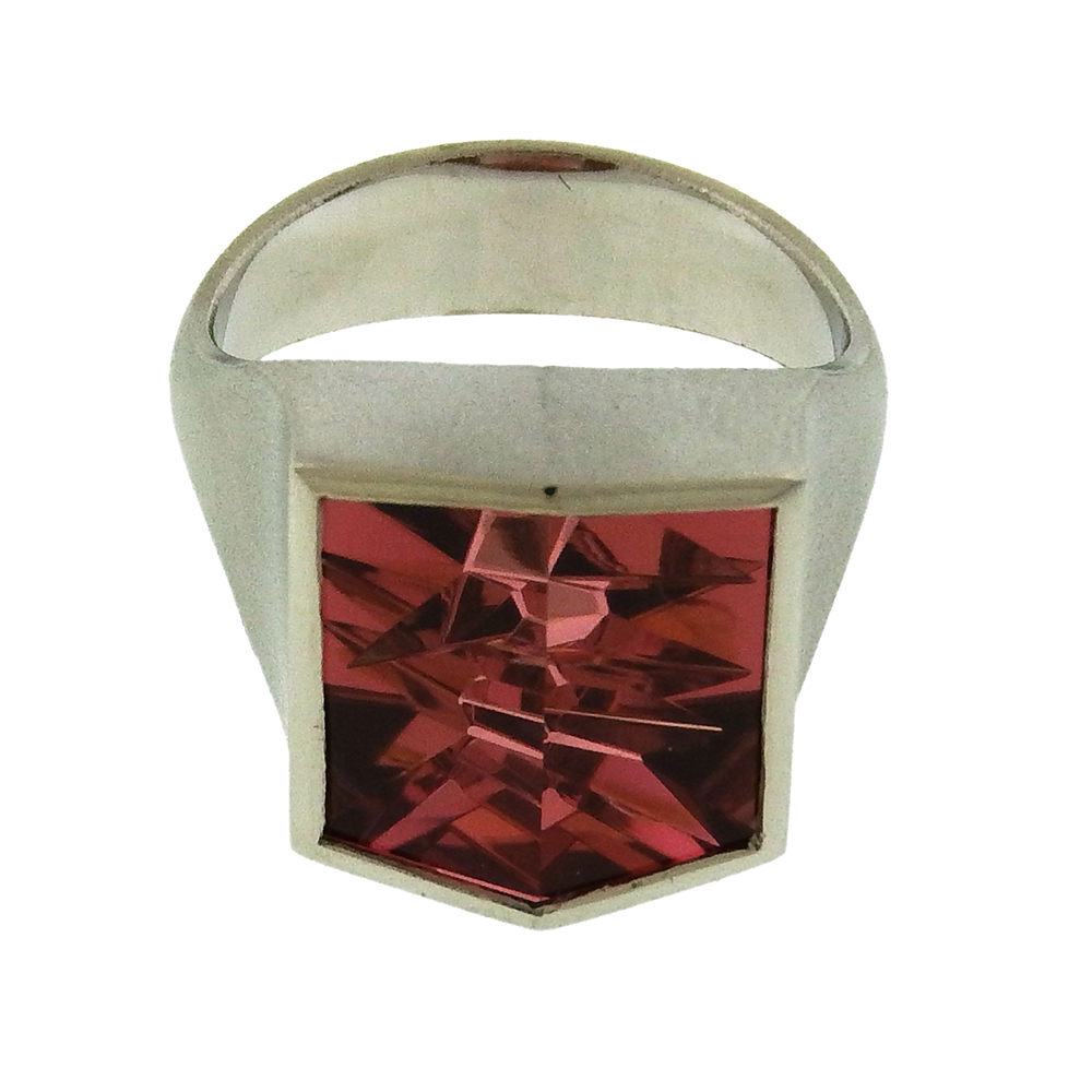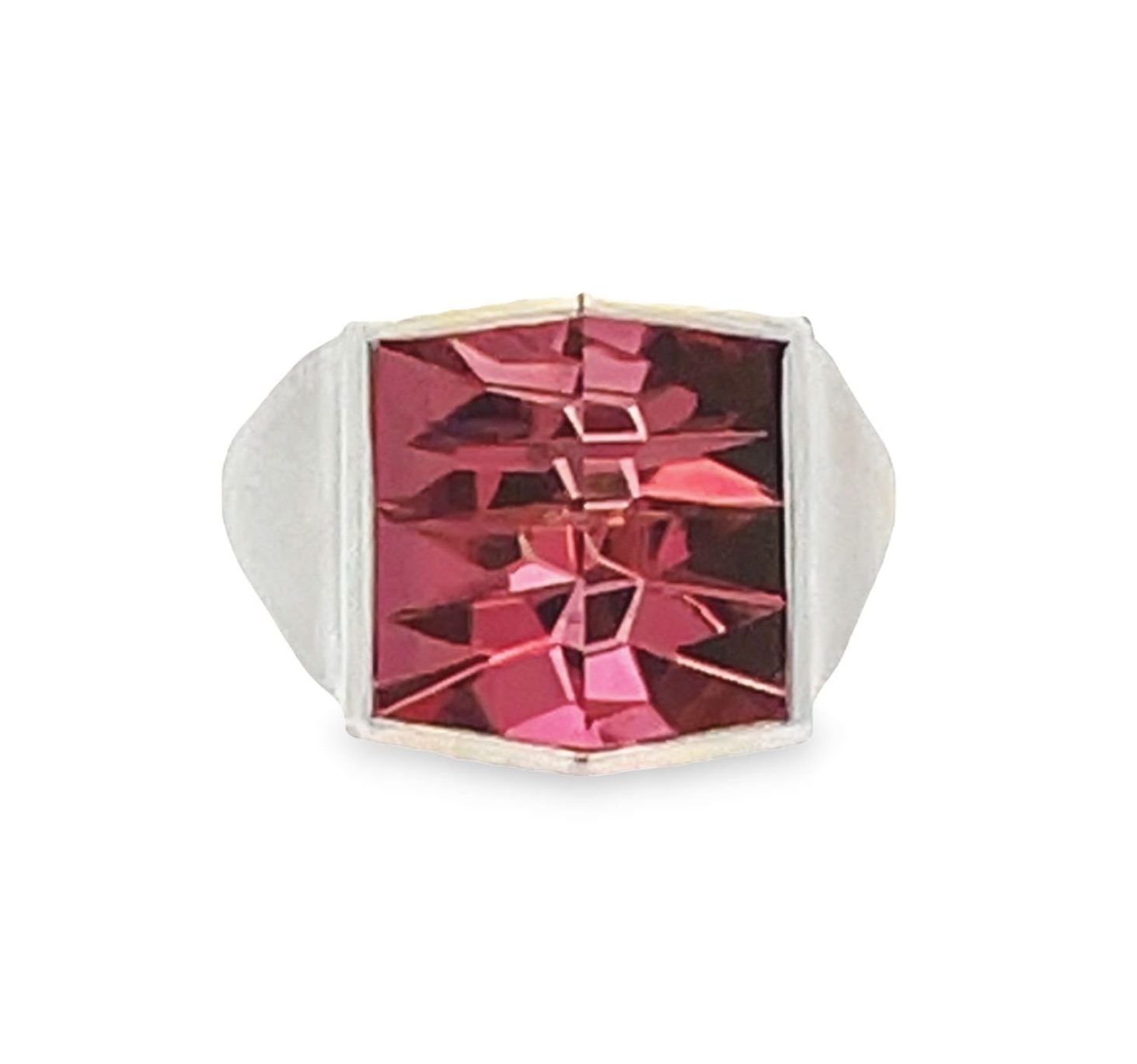 Tom Munsteiner’s deep pink square gem tourmaline, 7.32 carats, is incised below and beveled in two facets on top, set in platinum. The ring measures 1/2″ square x 3/8″ above the hand and is size 6.5.