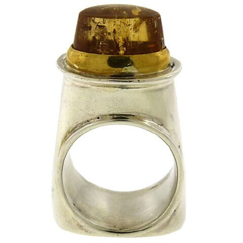 Precious topaz tops Glenda Arentzen’s pyramidal ring, heavy sterling silver tapering to an 18K wide bezel that holds the honey-colored oval precious topaz. The bottom of the ring is a smooth polished oval mirroring the topax and making the ring balanced and comfortable to wear. Measures 1/2″ above the finger. Size 6.
