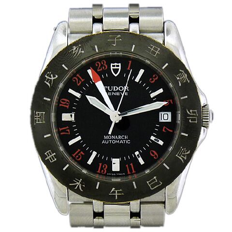 Rare stainless steel automatic Tudor Monarch, made in Switzerland by Rolex, it is a graphic 24 hour two time zone watch, with black dial, center second sweep, luminous hands including red-tipped 24 hour hand, date aperture at 3 o’clock and outer rotating bezel with 12 Chinese zodiac symbols for each month, stainless steel bracelet, 36mm case with crown guard in very good condition.