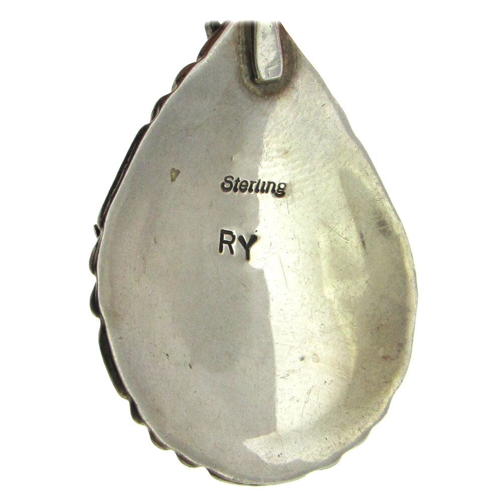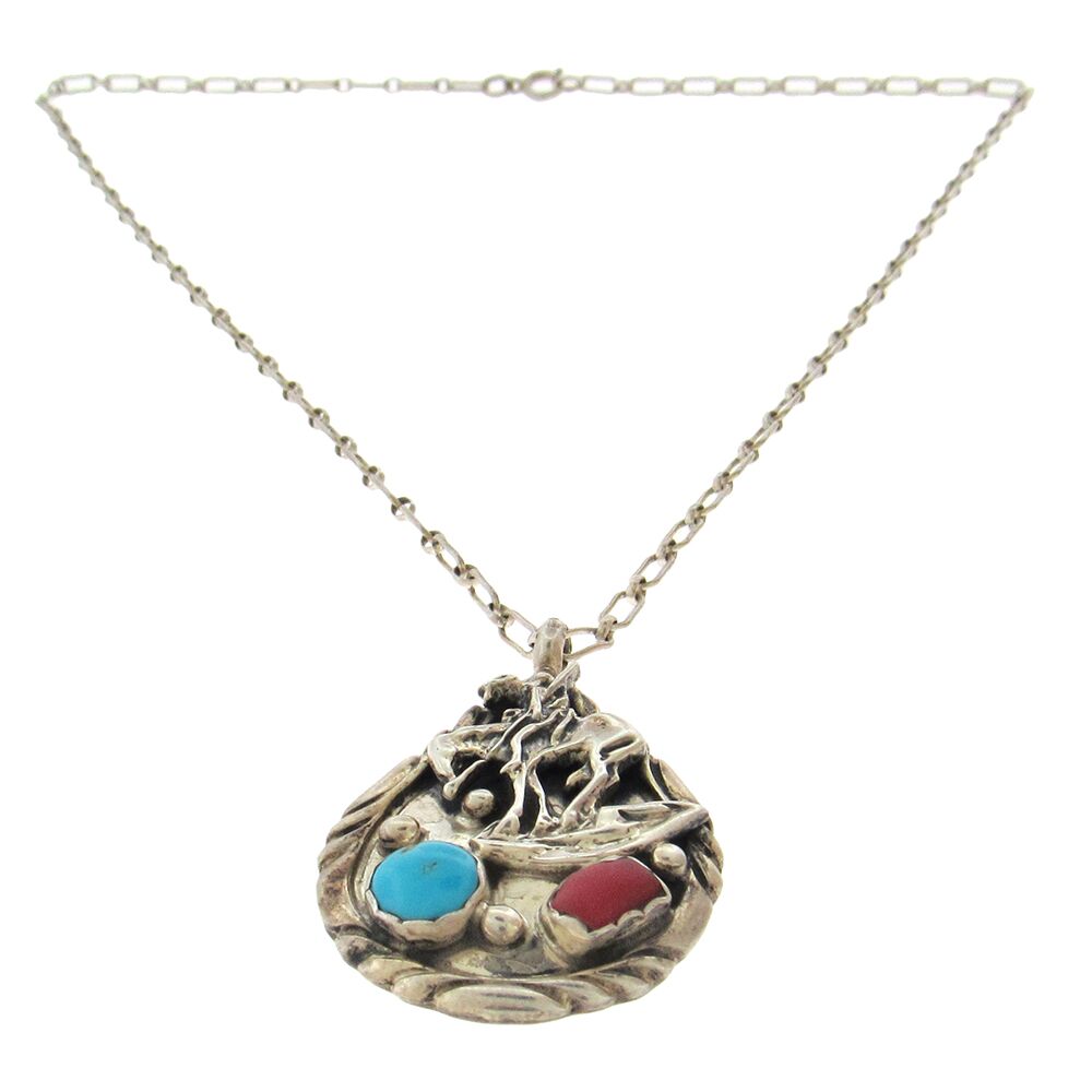 Sterling silver teardrop shape pendant, 1″ x 1-1/2″, depicting a horseback rider, set with below with turquoise and coral cabochons. The sterling chain is 18″, the pendant stamped sterling and RY.