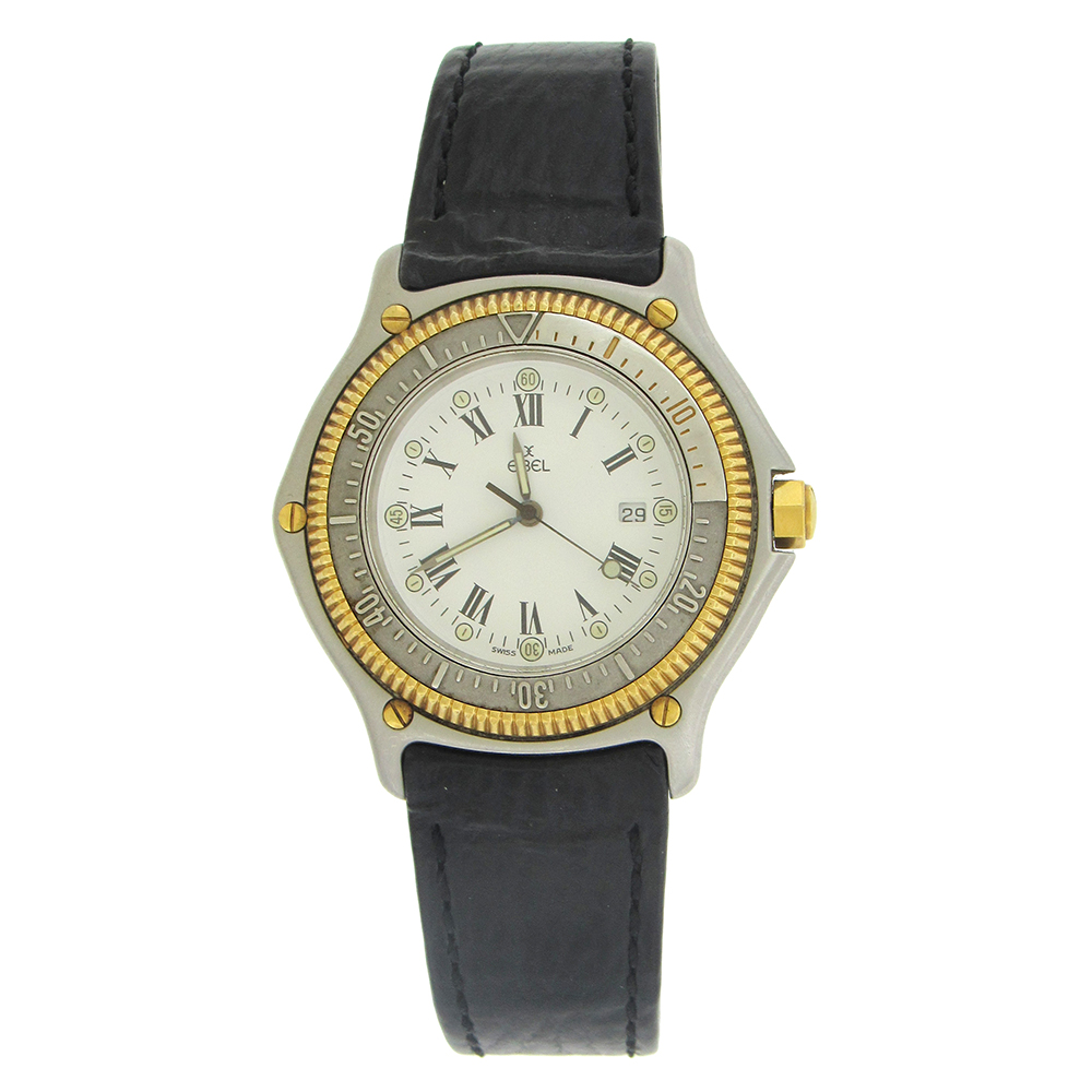 Stainless steel and 18K gold Ebel Discovery diver’s watch, circa 2000, is a 38mm steel water resistant watch with screwed-down steel back, leather band with steel deployant, 18K gold crown and coin-edge bezel, porcelain white dial with date window at 3, center second sweep hand and outer luminous 13 second markers. The quartz movement is warrantied by Aaron Faber for 1 year.