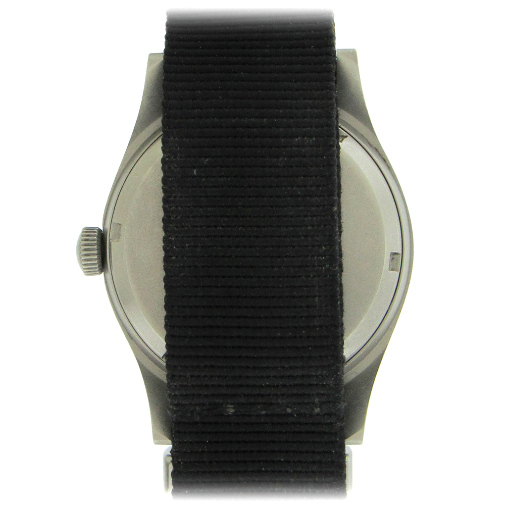 Steel United States military wristwatch, dated 1983 issue on back, is a 33mm manual wind watch, black dial with luminous Arabic hours, inner 24 hour reserve, center second sweep hand and luminous hands. The manual wind movement is warrantied by Aaron Faber for 1 year.