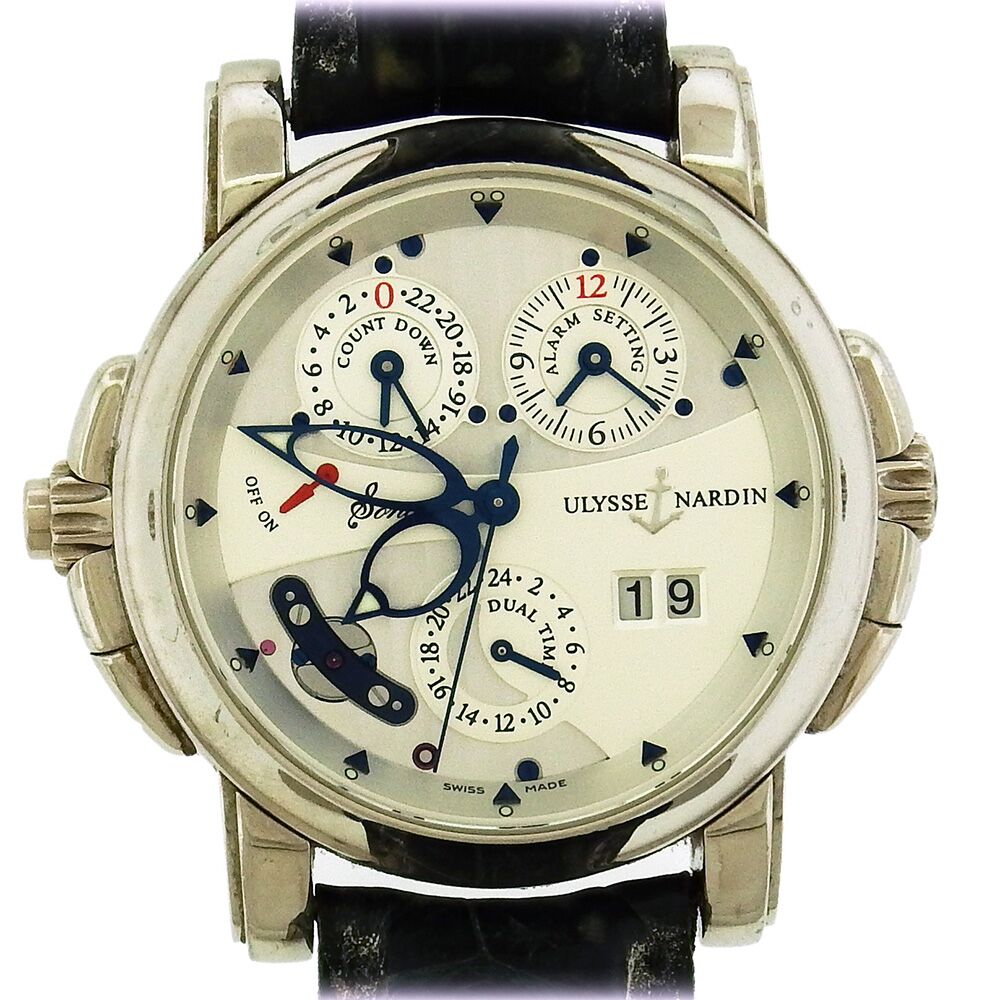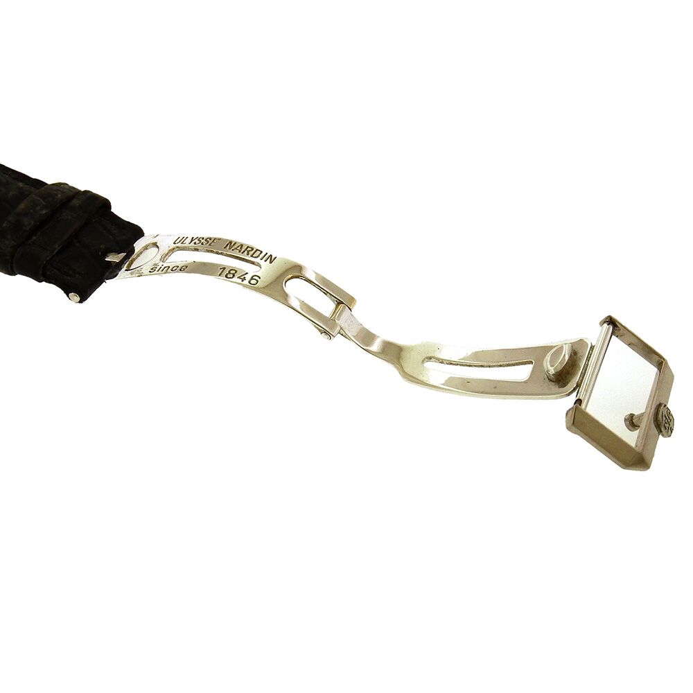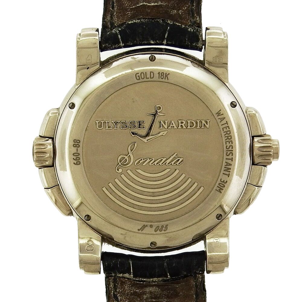 18K white gold Ulysse Nardin Sonata 660-88 is a 42mm mechanical alarm watch with a musical chime/ring. While the alarm is ringing you can see the piston at work – located at the 8 o’clock position & held in place with a blue bridge. The silver ridged dial is overlaid with the register dials: the alarm time set at 2, the GMT/24 hour time zone at 6 and, at 10 o’clock, the countdown indicator for the alarm – the alarm will chime once in 24 hours, the countdown will indicate if the alarm will chime AM or PM. The On/Off indicator is at 9, controlled by the button in center of the left crown. The left crown itself adjusts the date, with GMT buttons on the side to change the time-zone by one hour increments either way. 18K white gold UN deployant buckle. The mechanical automatic movement is warrantied by Aaron Faber for two years.