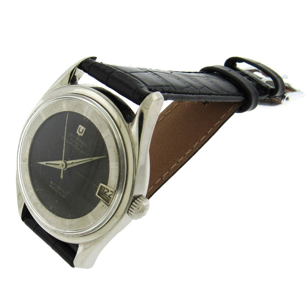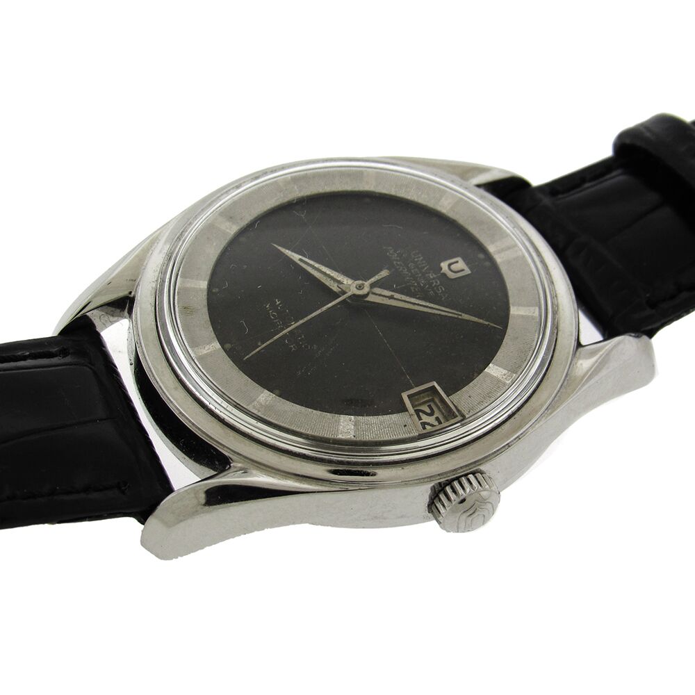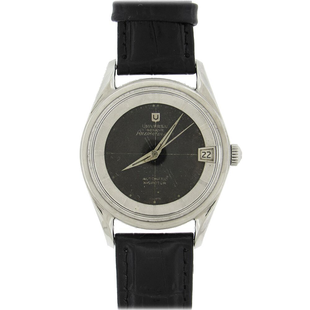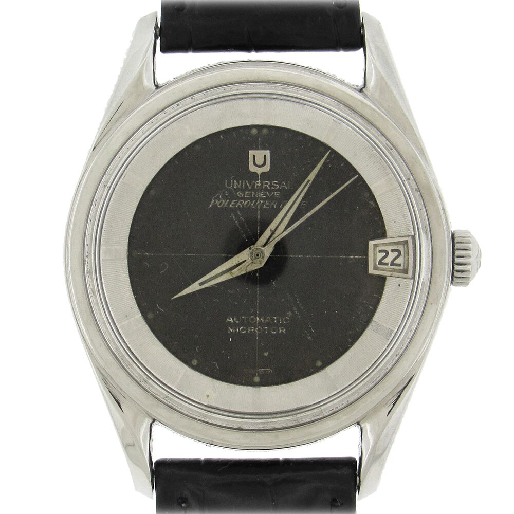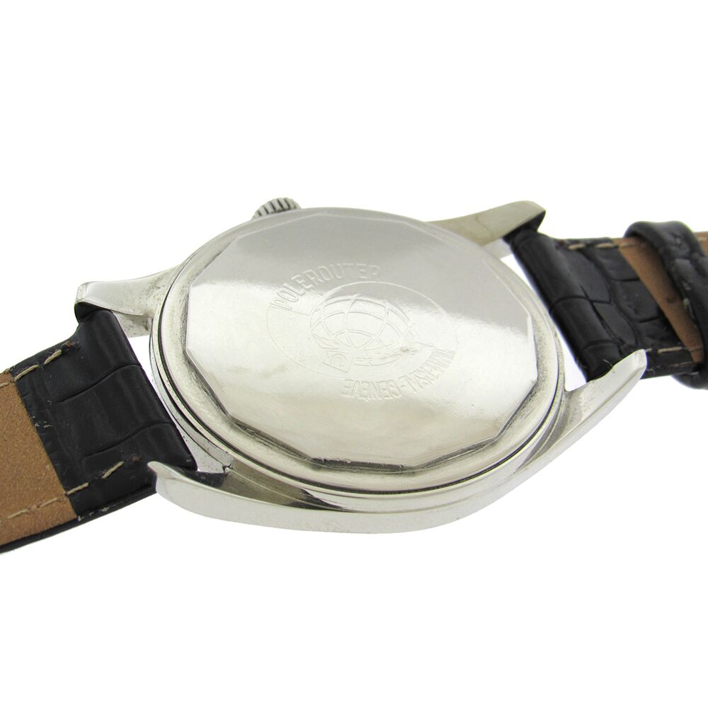 Universal Geneve first introduced the Polerouter Date in 1959. This handsome stainless steel automatic version circa 1961, has a 35mm case, with a striking two-tone silver and black original dial. The engraved hour chapter ring features steel hour markers, date window at 3 o’clock, and center second sweep hand. Water resistant screwdown back. The automatic movement is warrantied for 12 months by Aaron Faber. The Polerouter was launched by Universal in 1954 to celebrate the inauguration of the ‘Polar Route’ by Scandinavian Airlines, whose pilots wore the watch on their special flights. It was manufactured in steel, 14K and 18K gold.