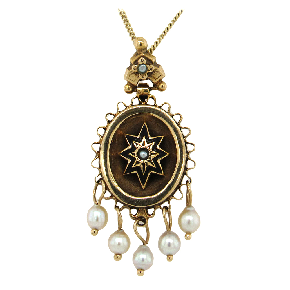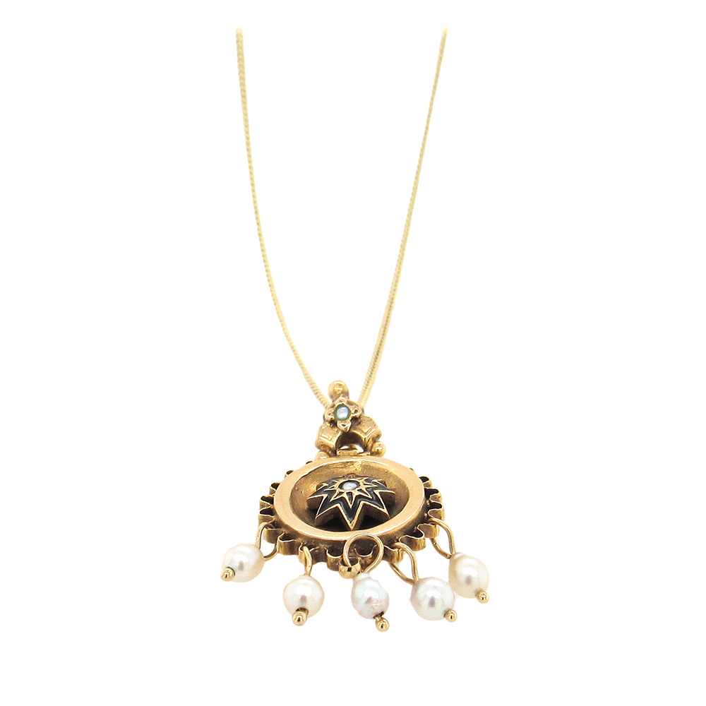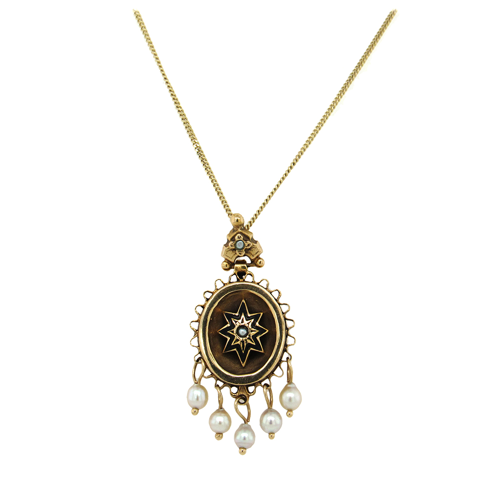Victorian 8 pointed star in black enamel and gold pendant with drop pearls measures 5/8″ x 1-1/2″, shown on 18″ 14K chain sold separately CHA01483.