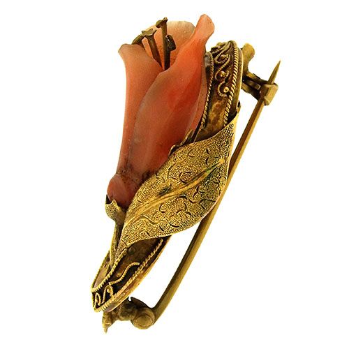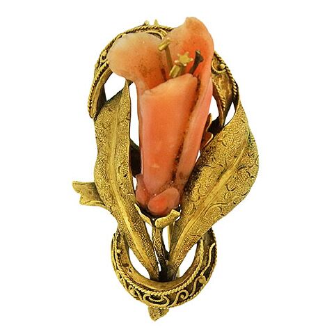 Charming Victorian coral and gold brooch, 14K gold, measures 3/4″ x 1-1/2″, the intricately engraved and beaded leaves and frame wrapping around the coral bud with its gold pistils.