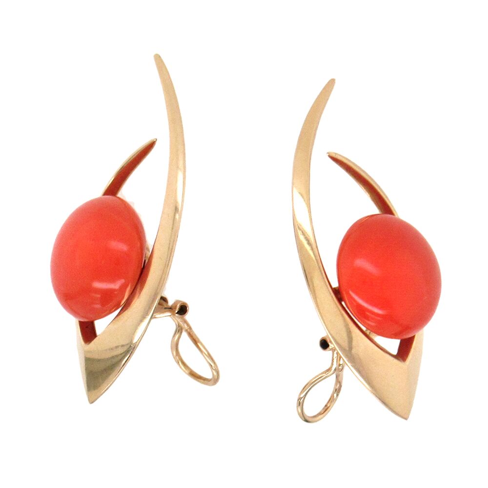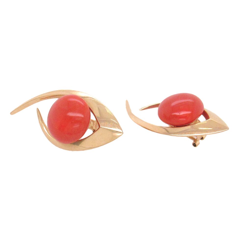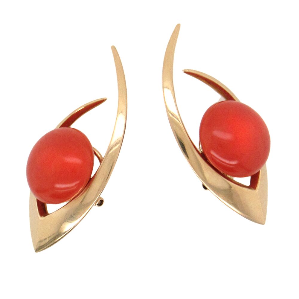 18K gold Retro style coral earclips with stylized V-shape frame set at center with 16mm coral button cabochon. The earrings measure 1-1/4″ x 1-3/4″. Circa 1960’s, French hallmarks.