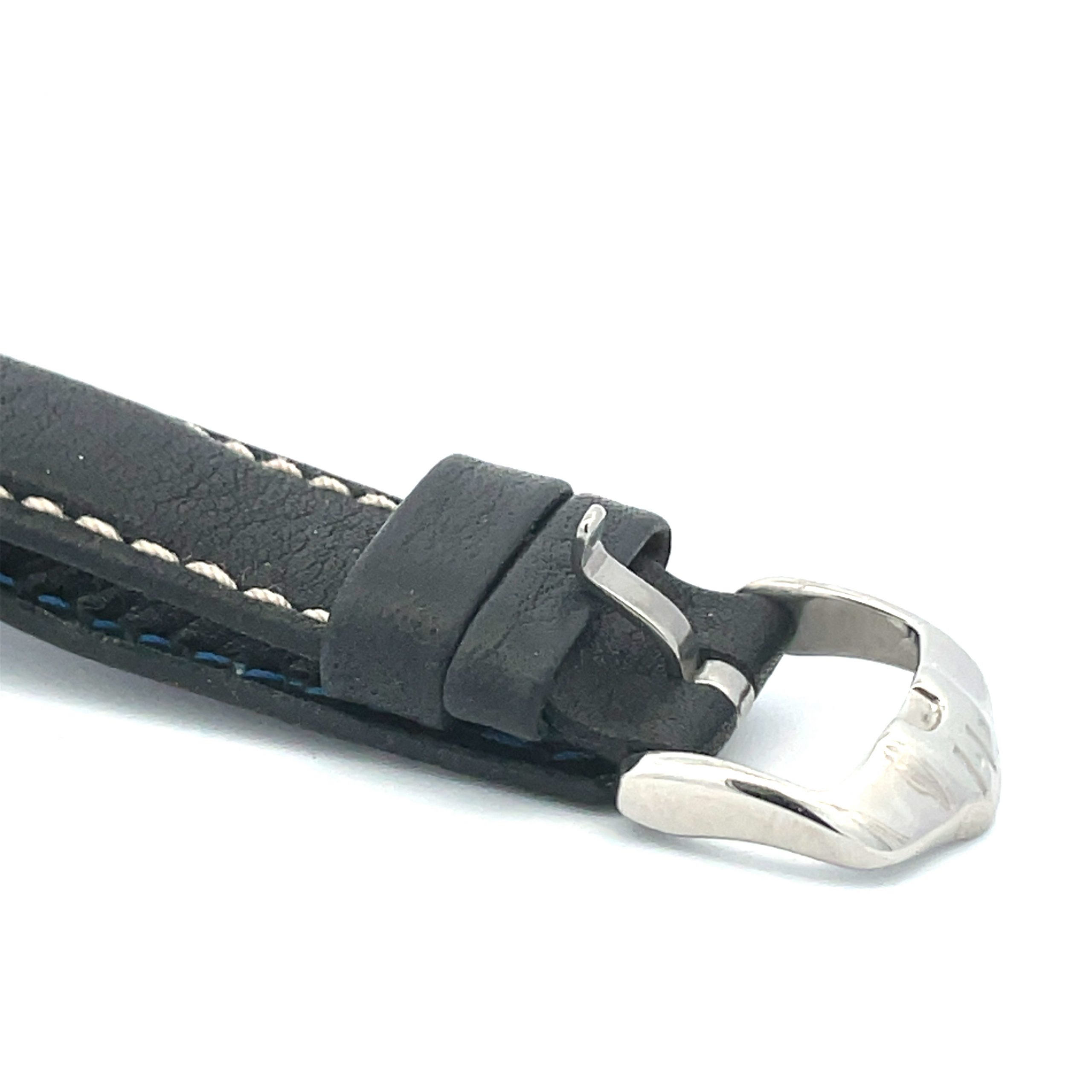 Rare stainless steel Solvil Paul Ditisheim triple calendar moon phase is a great design and collectible from this Swiss maker brand, circa 1960. The 35mm case has a screwed down back, white dial with outer blue Arabic date numerals, French day and date windows at 12, moon 5phase at 6, and applied steel lance hour markers. The calibre 1402 automatic movement, 18J, is warrantied by Aaron Faber for 2 years.