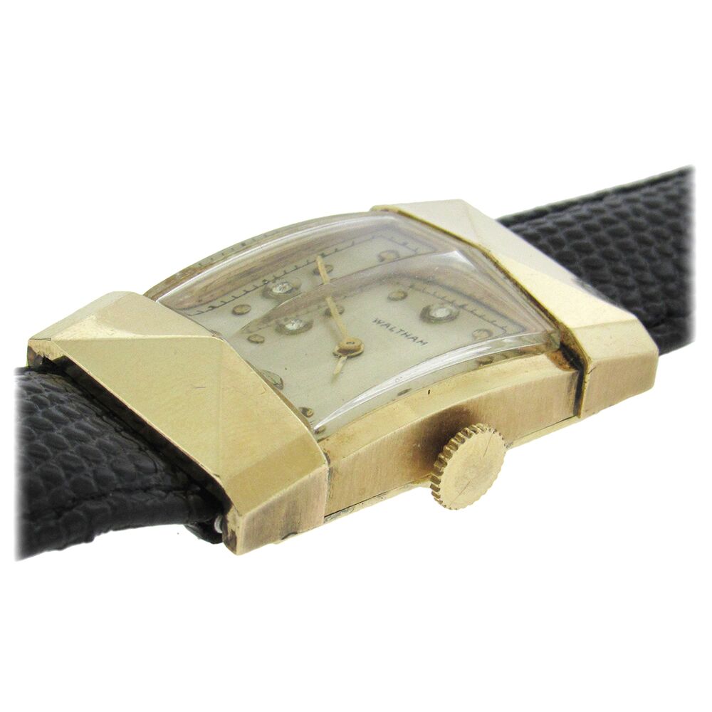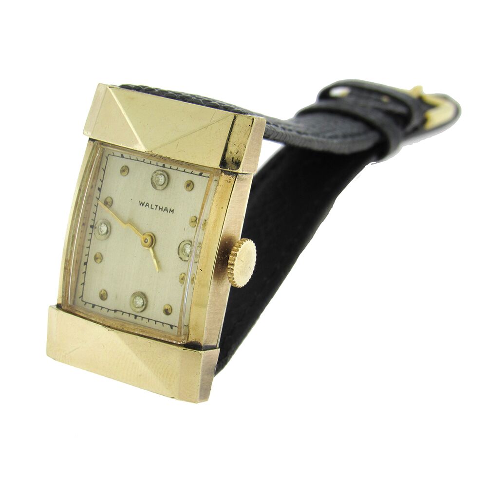Stylized vintage Waltham gold-filled tank wristwatch, circa 1940’s, measures 22mm x 37mm, and features chevron hooded lugs, matte silvered dial with diamonds quarter hour markers. The mechanical manual wind movement is warrantied by Aaron Faber for one year.