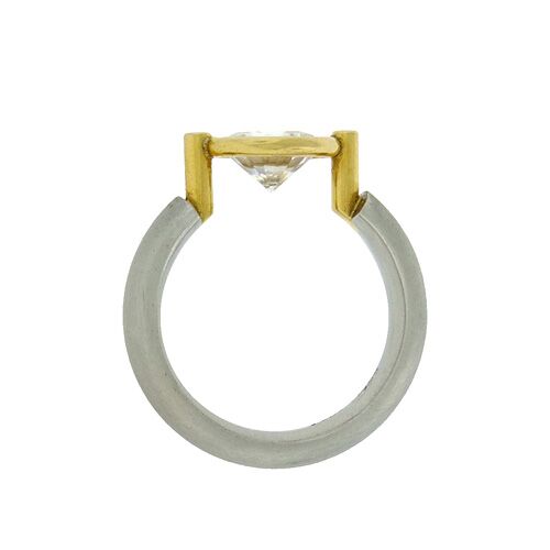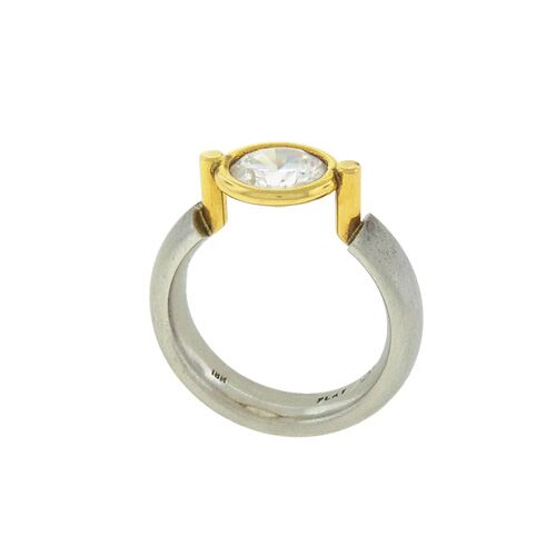 Whitney Boin, master of post-Modern bridal jewelry, creates a variation on his original ‘Post’ design, with this lighter, airier version in which the solitaire is set in a circle of 18K yellow gold floating between two 18K posts, and the wide matte platinum band, for a 1.50 to 2 carat diamond.