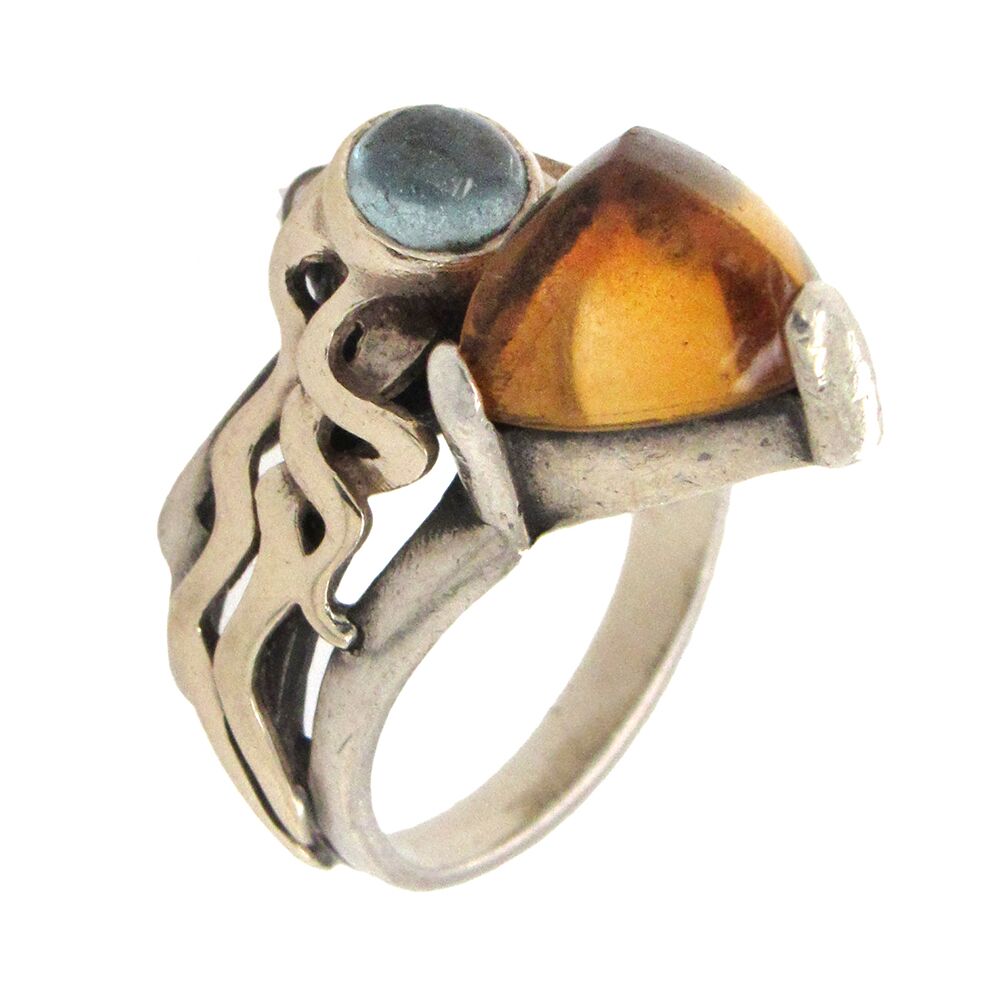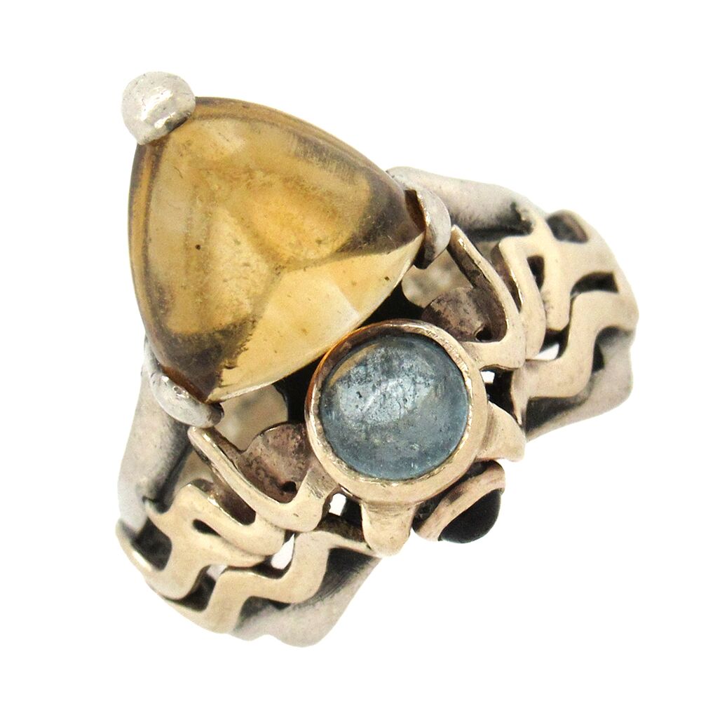 Charming sterling and 14K gold ring hand fabricated by goldsmith William Scholl , circa 1990’s, is set with a triangular cabochon citrine and accent cabochons aquamarine and sapphire, with interwoven gold and silver mounting. The ring measures 3/4″ x 58″ x 3/8″ above the hand and is size 6.