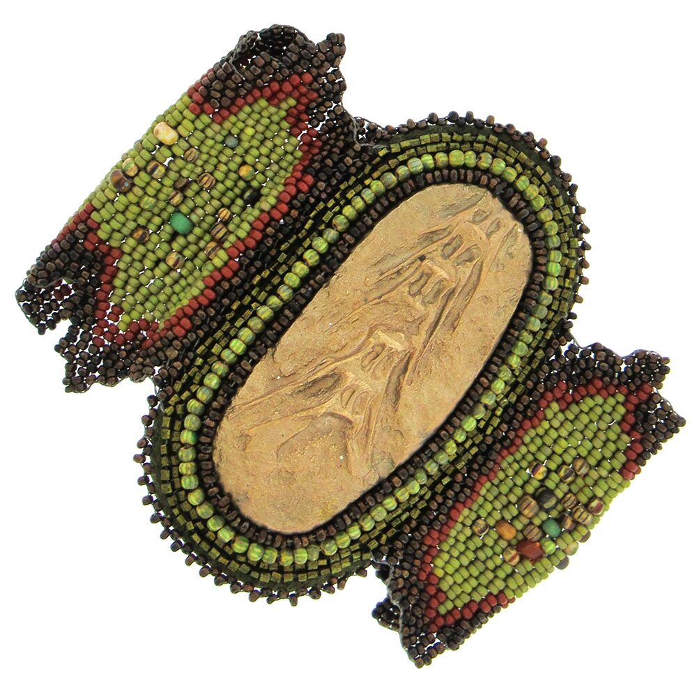 Woven glass bead fabric bracelet by Jackie Haines, circa 1990’s, is 2-3/4″ at the widest x 6-1/2″ long with a gold-fill button loop clasp and center repousse abstract tower.