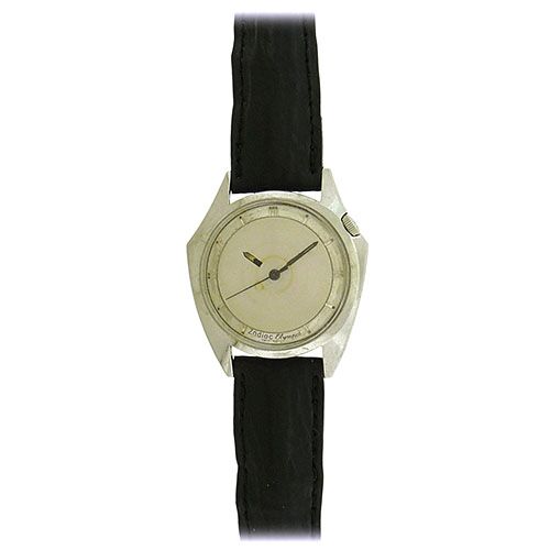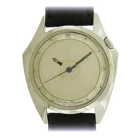 Stainless steel Zodiac Olympos, produced in the 1960’s, is a center-seconds, self-winding, asymmetrical stainless steel wristwatch. The 36mm x 41mm asymmetrical case has pillar-shaped lugs and recessed winding crown at 2 o’clock, The silvered mystery dial features outer hour reserve chapter, rotating hour hand disc and minute hand with center second sweep. D. anthracite with indexes in an outer steel ring. “Bâton” radium-coated hands. The caliber 70-72 automatic movement is warrantied by Aaron Faber for 12 months.