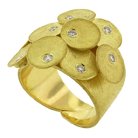 18K gold and diamond 'Flo' ring from Enric Majoral makes its presence known with its cluster of diamond-centered circles on a wide band,this is a comfortable as well as dramatic design,3/4" wide at top.