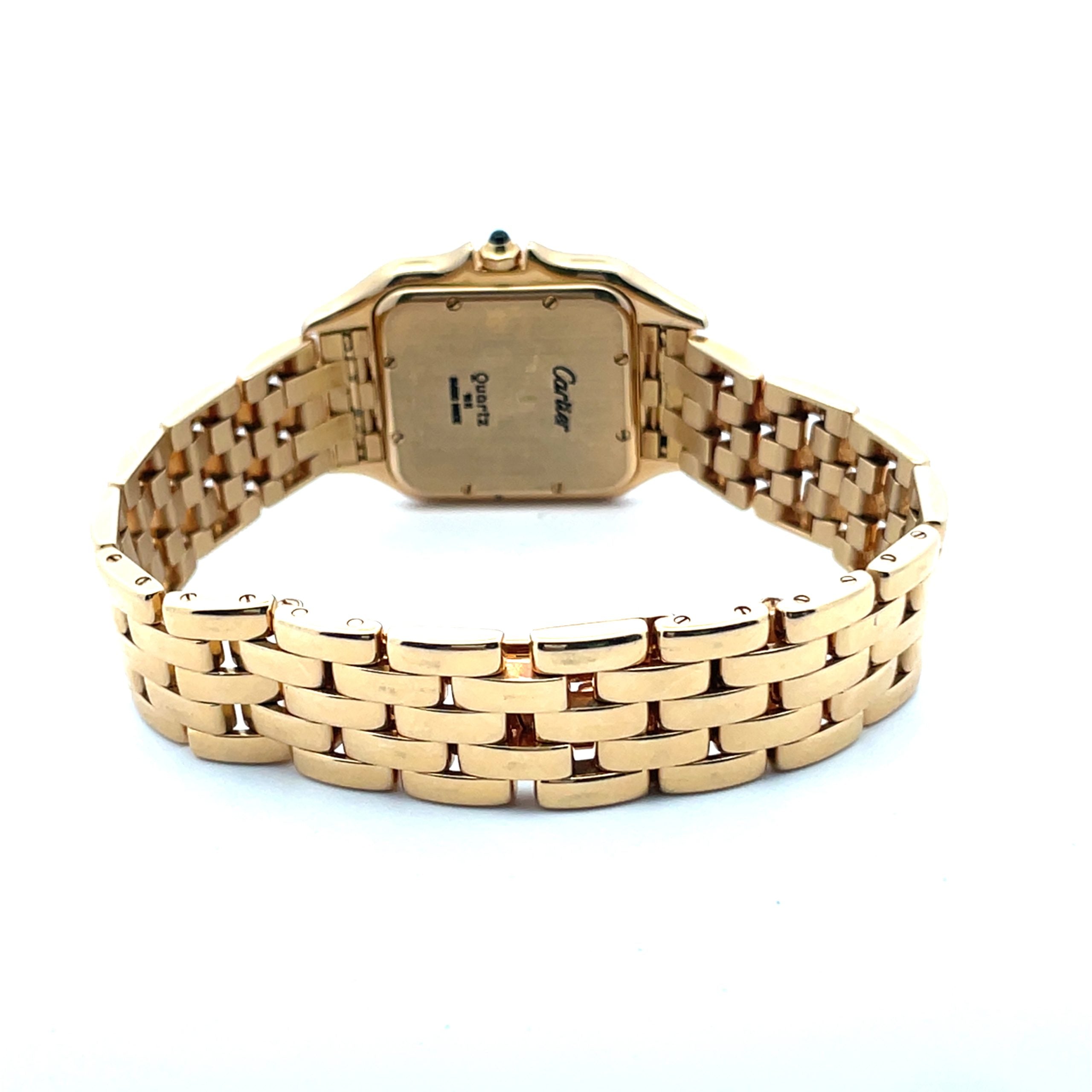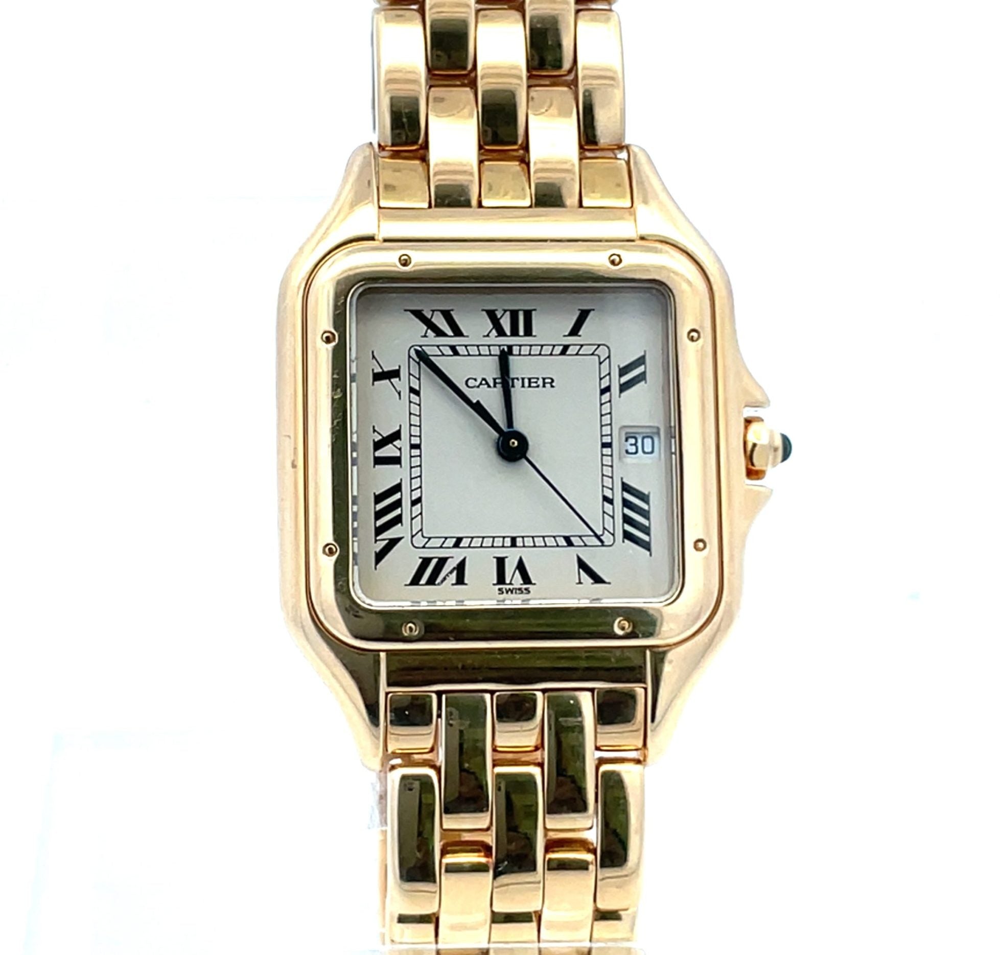 18K yellow gold Cartier Panthère, made in the 1980's, is a square, water-resistant, 18K yellow gold mid-size quartz wristwatch with an integrated 18K yellow gold Cartier link bracelet with double deployant clasp, accompanied by Cartier box .The 27mm x 37mm (lug to lug) case has a case back with 8 screws, bezel with 8 pins, protected octagonal sapphire-set winding crown, and sapphire crystal. The ivory colored dial features painted radial Roman numerals, date window at 3, concentric minute track, secret Cartier signature on the VII, and blued steel épée hands. The movement is quartz standardization, warrantied by Aaron Faber for 2 years.