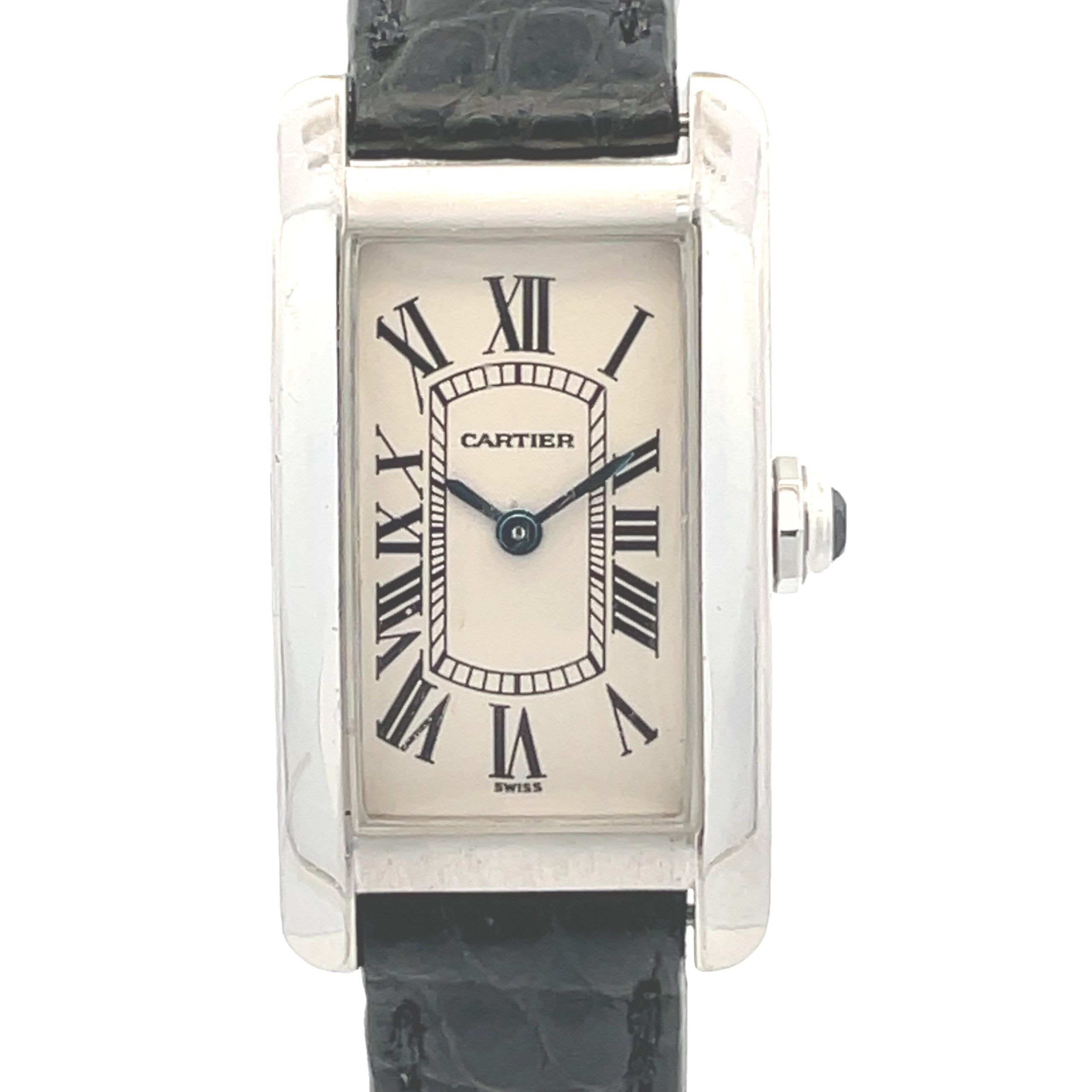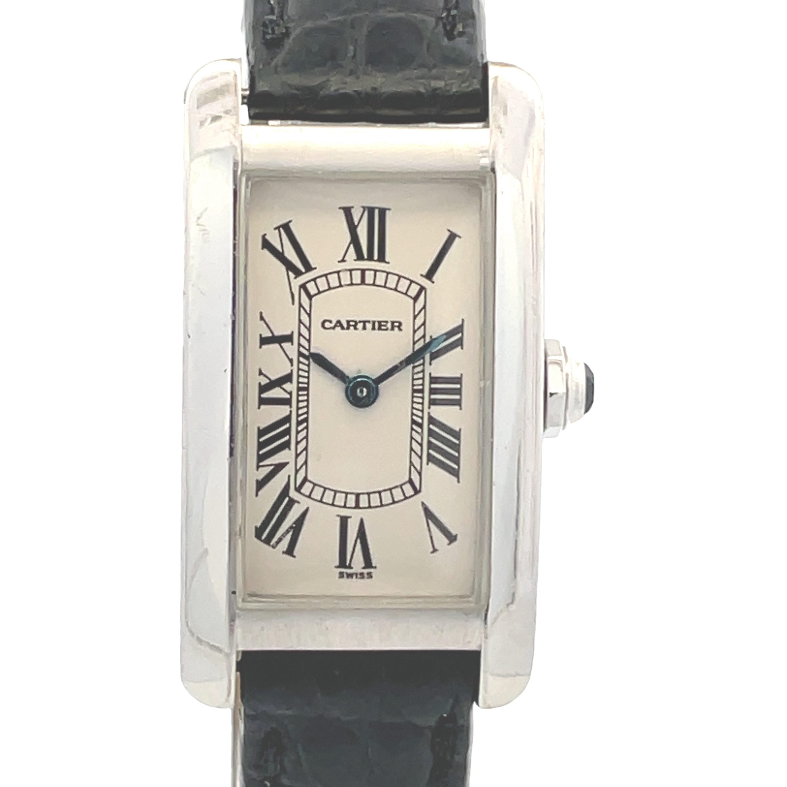 18K white gold Cartier Tank Americaine, Ref. 1713, circa 2000's, is a slim elongated quartz wristwatch, 19mm x 34mm, with a curved sapphire crystal, ivory white dial with painted black Roman numeral hours and secret Cartier signature at 7, faceted sapphire crown, original Cartier strap and 18K white gold Cartier buckle. The quartz movement is warrantied by Aaron Faber for 2 years.