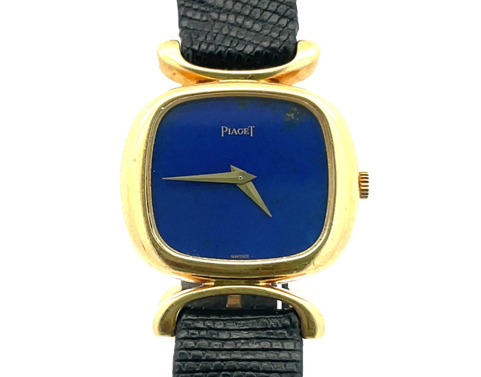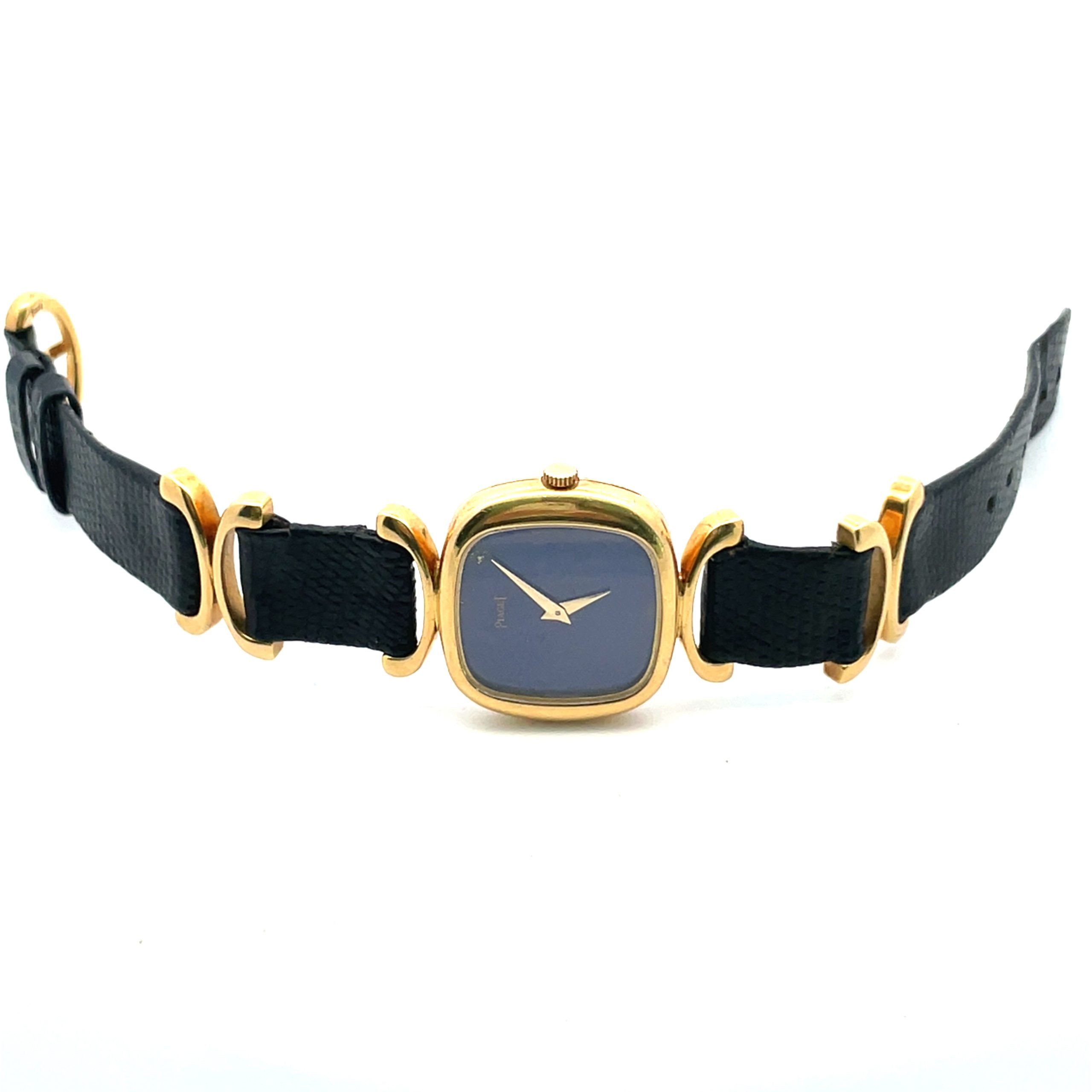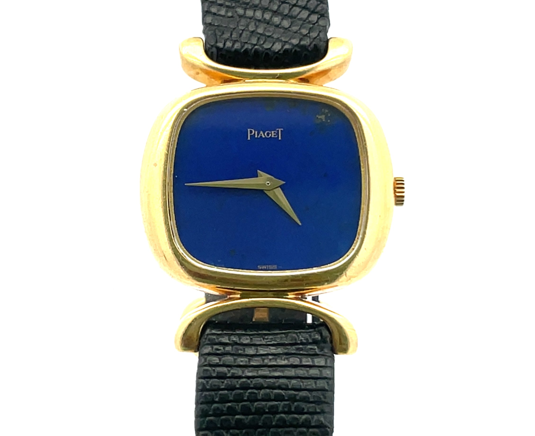18K yellow gold and lapis lazuli women's wristwatch, 25mm x 23mm, Ref. 9451D, circa late 1970's, has 18K stirrup lugs and an integrated strap bracelet with repeated 18K gold stirrup connectors, 7" total length, Piaget 18K buckle and strap. The lapis dial has 18K dauphine hands, manual wind 9P Piaget movement, the watch and movement are in excellent condition.