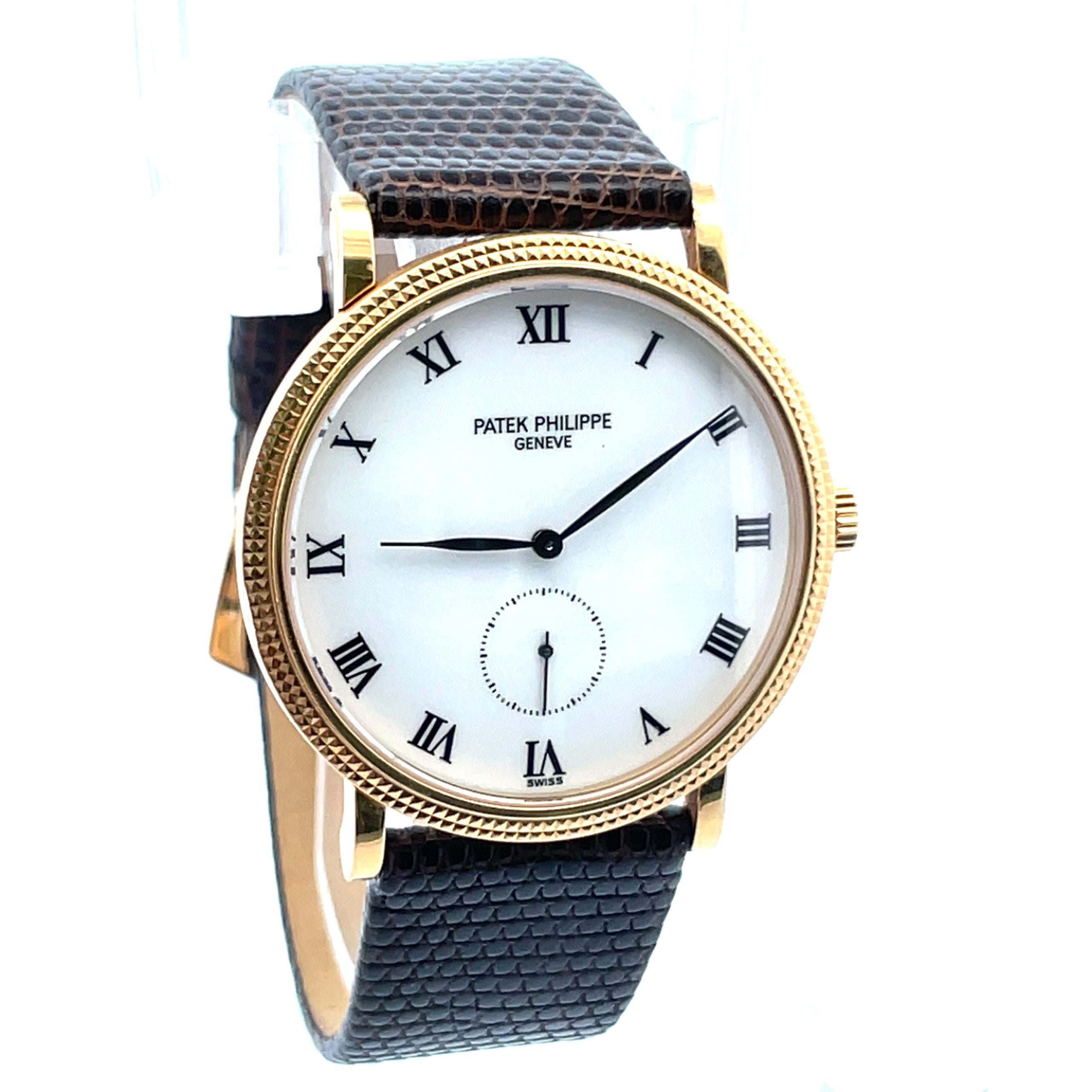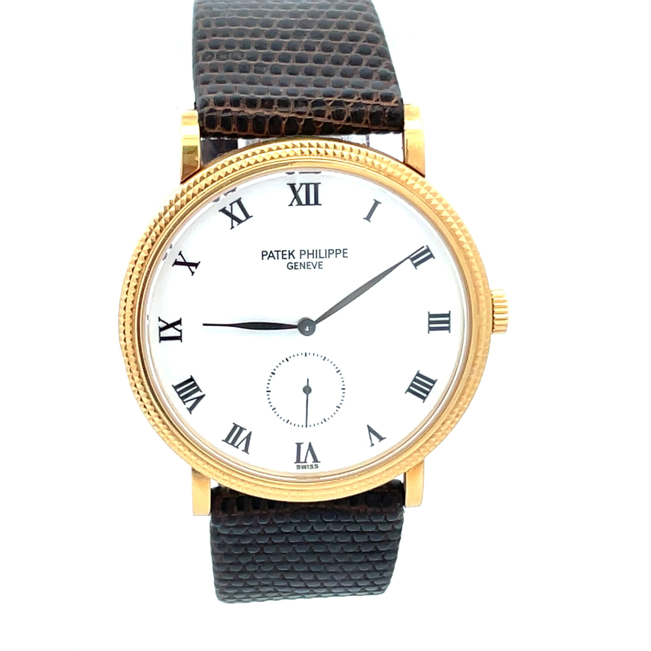18K yellow gold Patek Philippe Ref. 3919 'Clous de Paris' Calatrava, circa 1990, is a very thin 33mm hobnail bezel classic Patek, sapphire crystal, porcelain dial with painted black Roman numerals, subsidiary seconds dial and black oxidized gold leaf hands. The 18 jewel caliber 215 movement is manual wind warrantied by Aaron Faber for 2 years. This is the classic Patek model introduced in 1985 that became one of the most popular Patek watches in the market, discontinued in 1998. A timeless iconic design.