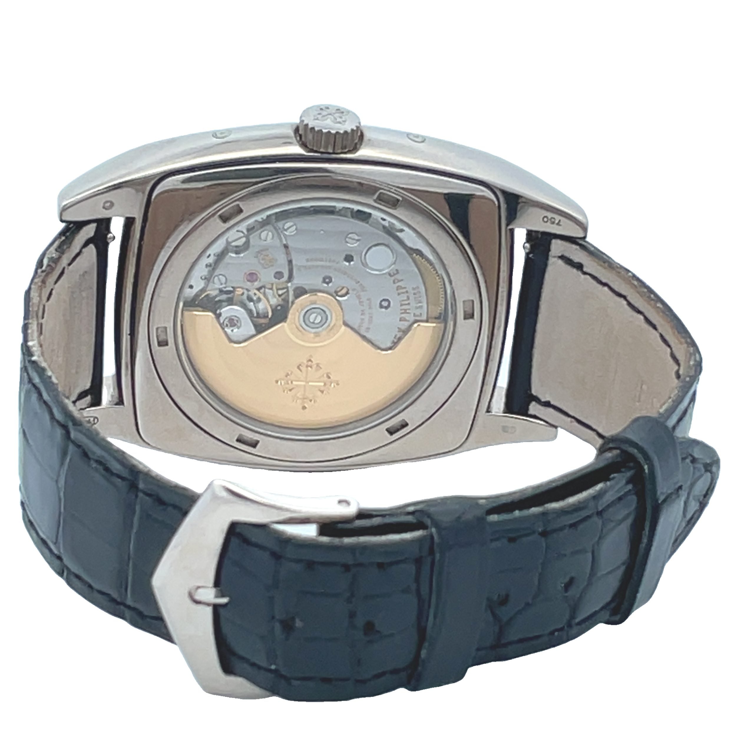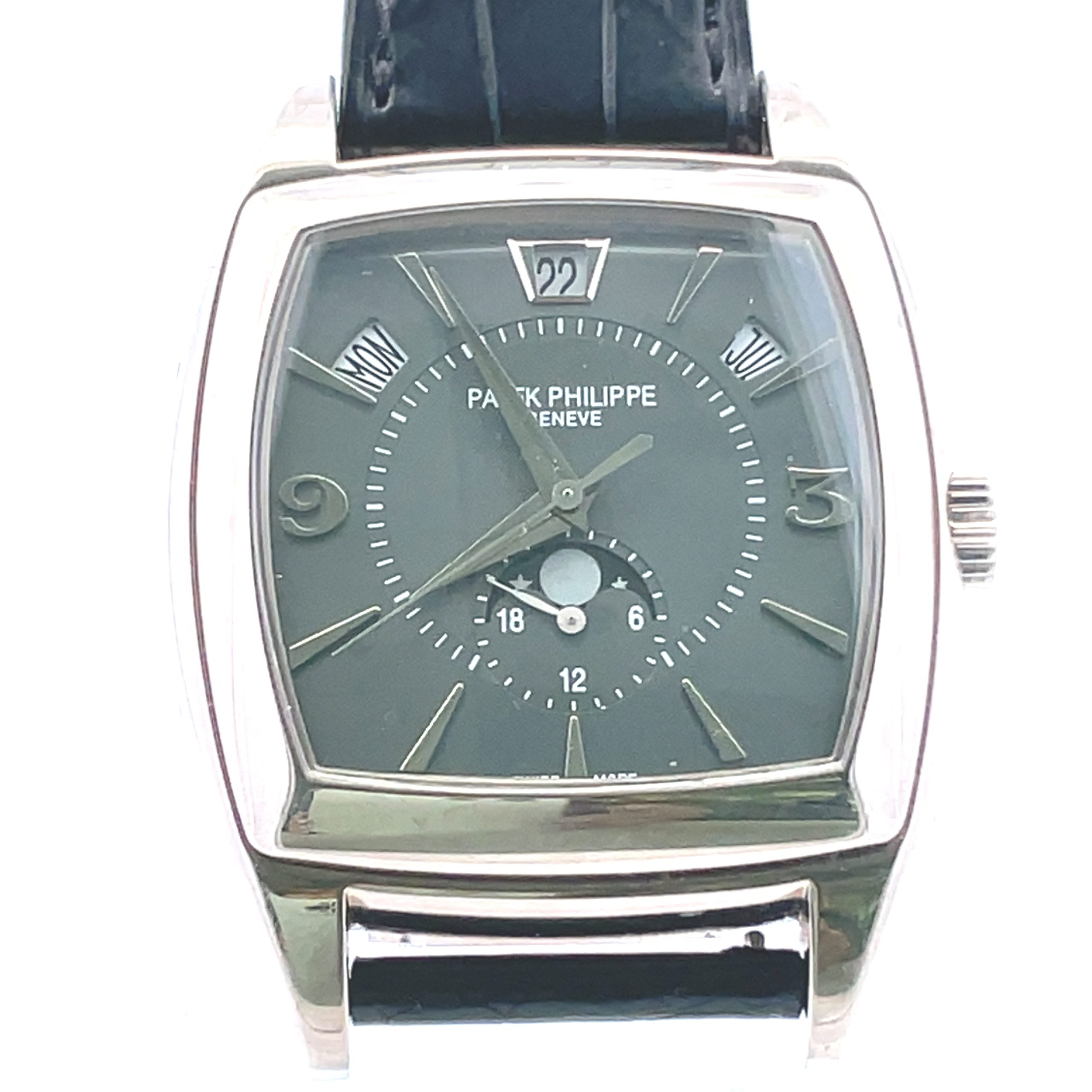 18K white gold Patek Philippe Ref. 5135G Gondolo Calendario automatic, circa 2006, is a rare oversize tonneau-shape moonphase calendar wristwatch. The 18K gold 38mm x 51mm case has a stepped bezel, curved lugs, correctors on the side of the case, transparent screwed-down case back, sapphire crystals. The anthracite dial has applied white gold Arabic numerals and dart indexes on a plain reserve, apertures for the days of the week at 10, the date at 12, the months at 2 and the moon phases and 24-hour display at 6, white gold dauphine hands. The 34 jewel automatic movement has a 21K rotor straight-line lever escapement, 21K gold rotor and is warrantied by Aaron Faber for 2 years.