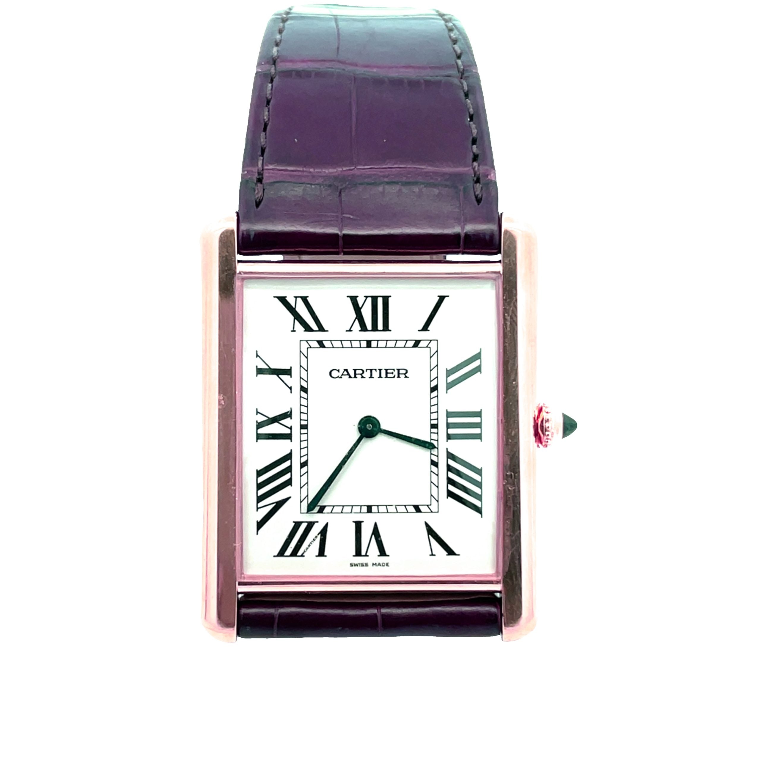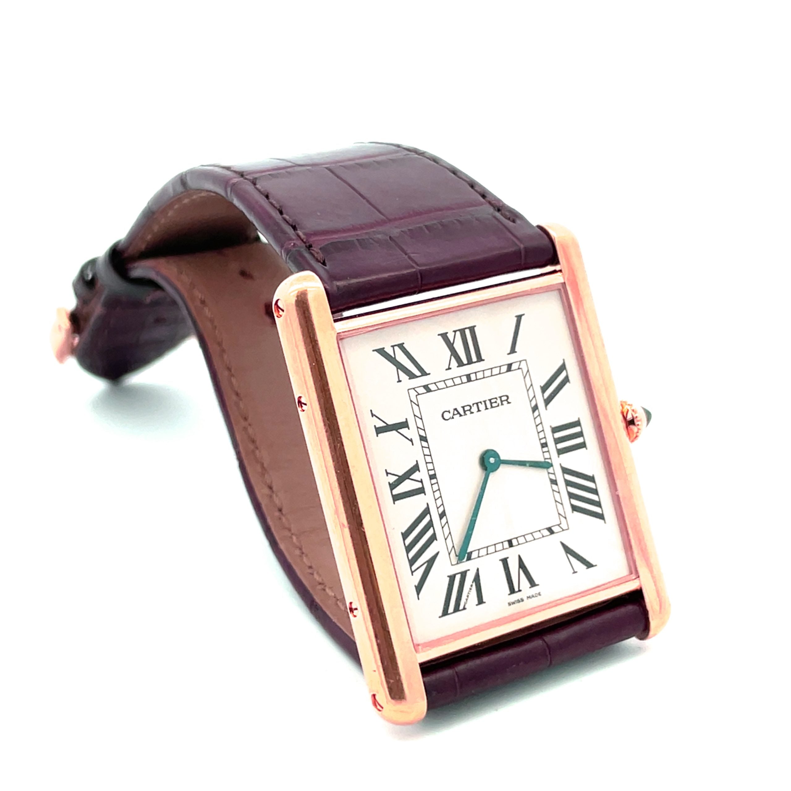 18K rose gold contemporary version of the most classic design from the Parisian brand the Tank Louis Cartier XL, circa 2013, in unworn condition. The 32.5mm x 40mm ultra slim case has a screwed down back, rounded bezel, ivory dial with painted black Roman numerals, secret Cartier signature at the VII, sapphire crown, Cartier matte alligator strap and 18K rose gold Cartier buckle. The manual wind mechanical movement is warrantied by Aaron Faber for 2 years.