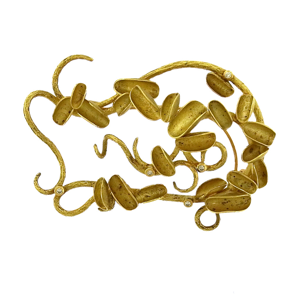18K yellow gold three-dimensional trellis brooch from So Young Park is fabricated in 18K gold and diamonds, the twining textured gold vines embellished with 18K gold stylized leaves, folded pods of matte and polished gold. This charming pin measures 1-5/8" w x 2-3/8" high, with a curved pin stem to hold and balance the pin.