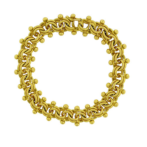 Lucie Heskett-Brem is the Goldweaver: she begins with a pure 24K gold ingot, alloys it slightly to 20K gold, then draws out the wires with which she will make each loop of this flexible double links heavy bracelet, in her studio by hand. Her work is truly luxurious, yet simple. 7-1/2" long, 1/2" wide.