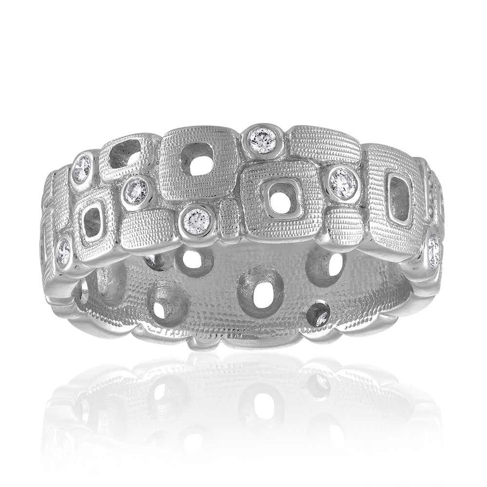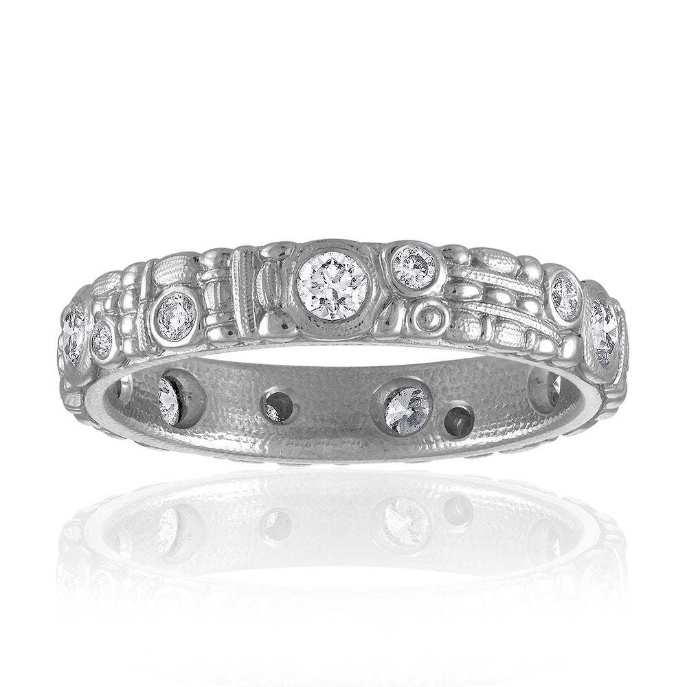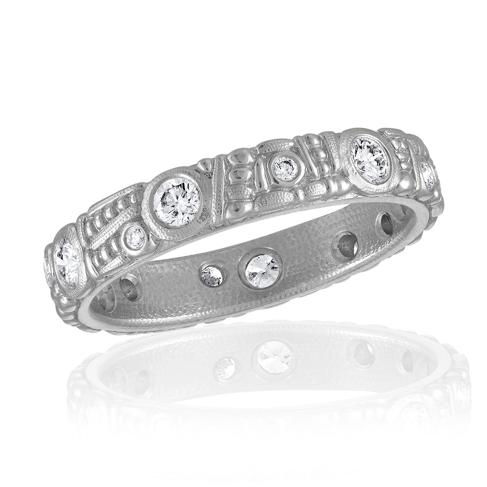Alex Sepkus' carved and bead narrow platinum and diamond band is 3.5mm, set with 0.42 cts diamonds.