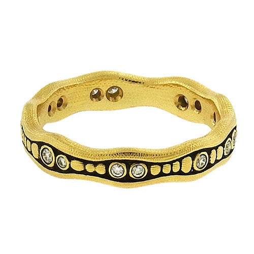 Alex Sepkus' 'Sparkling Stream' 18K gold wedding band ring curves in and out in perfect proportion to the 15 diamonds,0.20 cts tw, set at intervals in the nugget-like graduated gold segments. 4.6mm wide.
