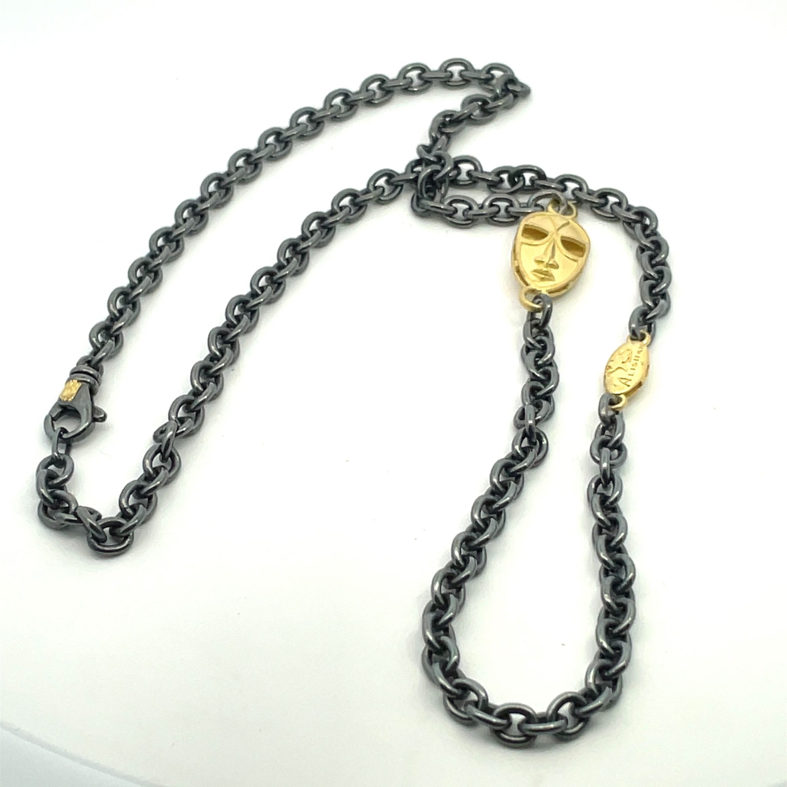 Designed by Alishan to wear everywhere, oxidized sterling chain with 18K yellow gold double mask link and ruby-set artist's hallmark in gold. 18" long.