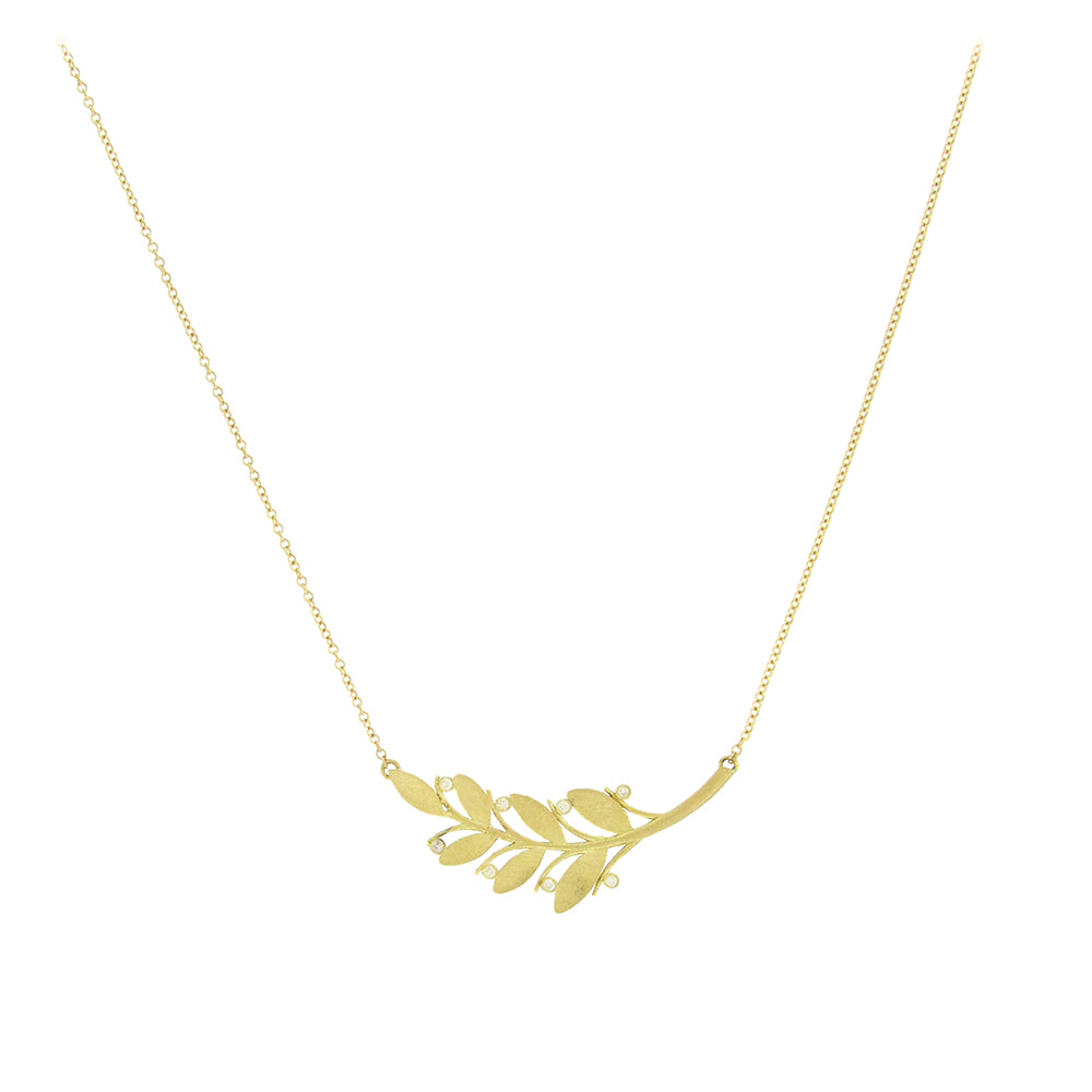 18K gold olive branch necklace by Alishan measures 1-1/4" x 3/8" on a 16-1/2" fine 14K gold chain.