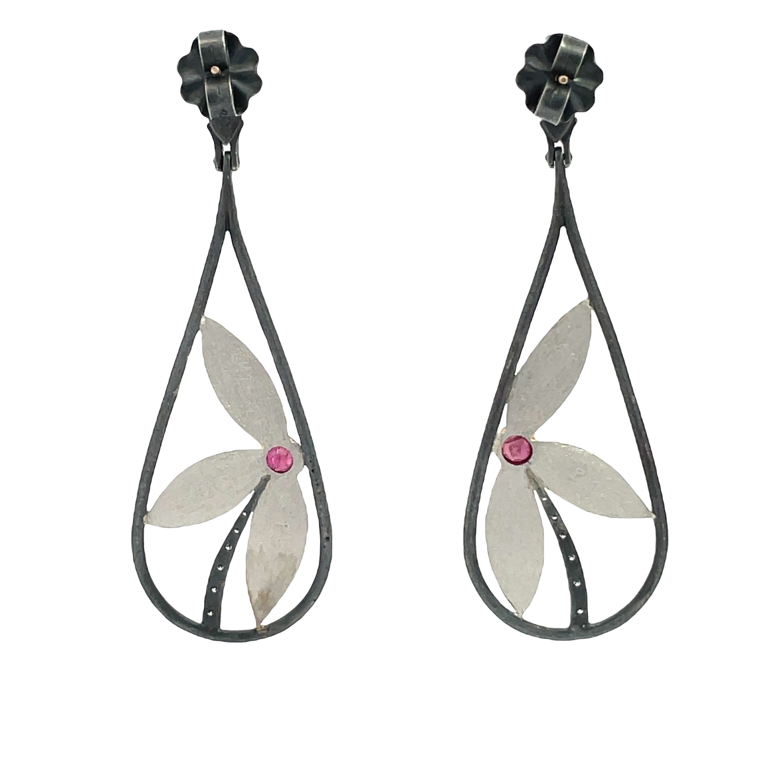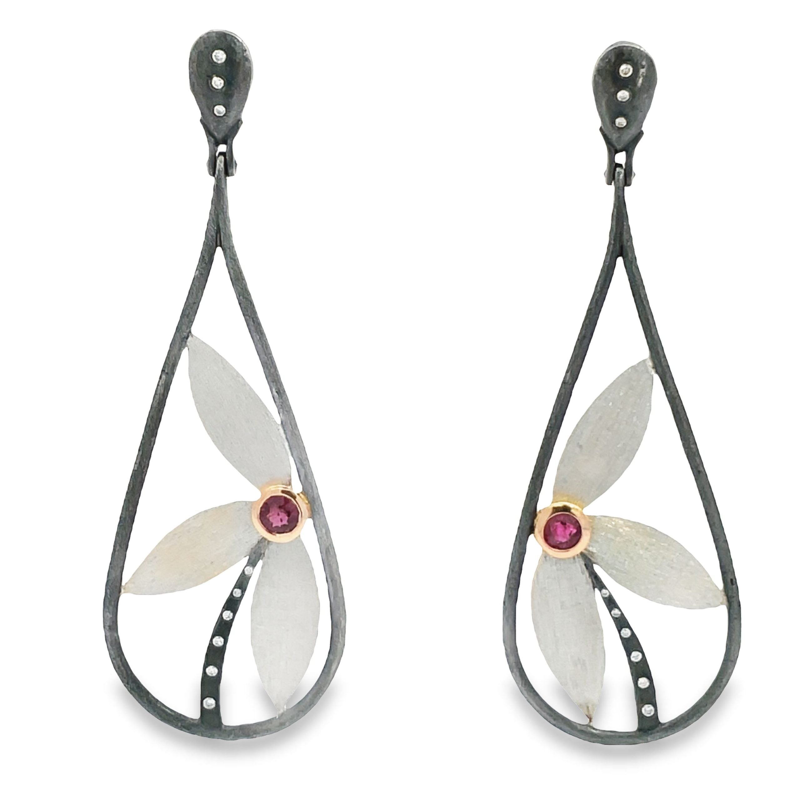 Dramatic joyful earrings from Alishan with bright white cut-out platinum petals, 0.63 carat round ruby center set in rose gold, oxidized sterling stems and tops. The earrings measure 7/8" at the widest x 2-1/2" long.