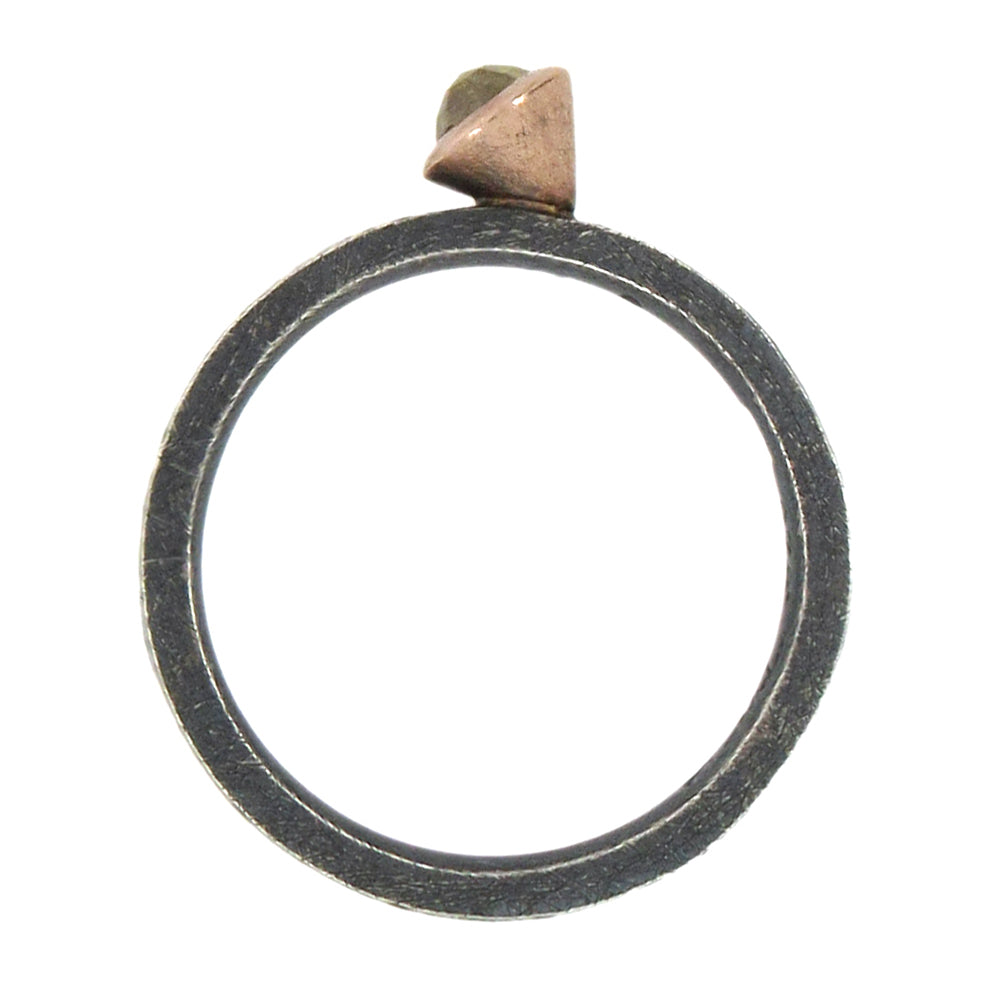 We love Alishan's natural diamond rings,to wear singly or in a group. He fabricates each one in his studio by hand,each one-of-a-kind,set with natural rose-cut diamonds. Here,an oxidized sterling band is set asymmetrically with a 0.30 ct rose-cut yellow-brown diamond in an 18K rose gold 'martini' mounting.