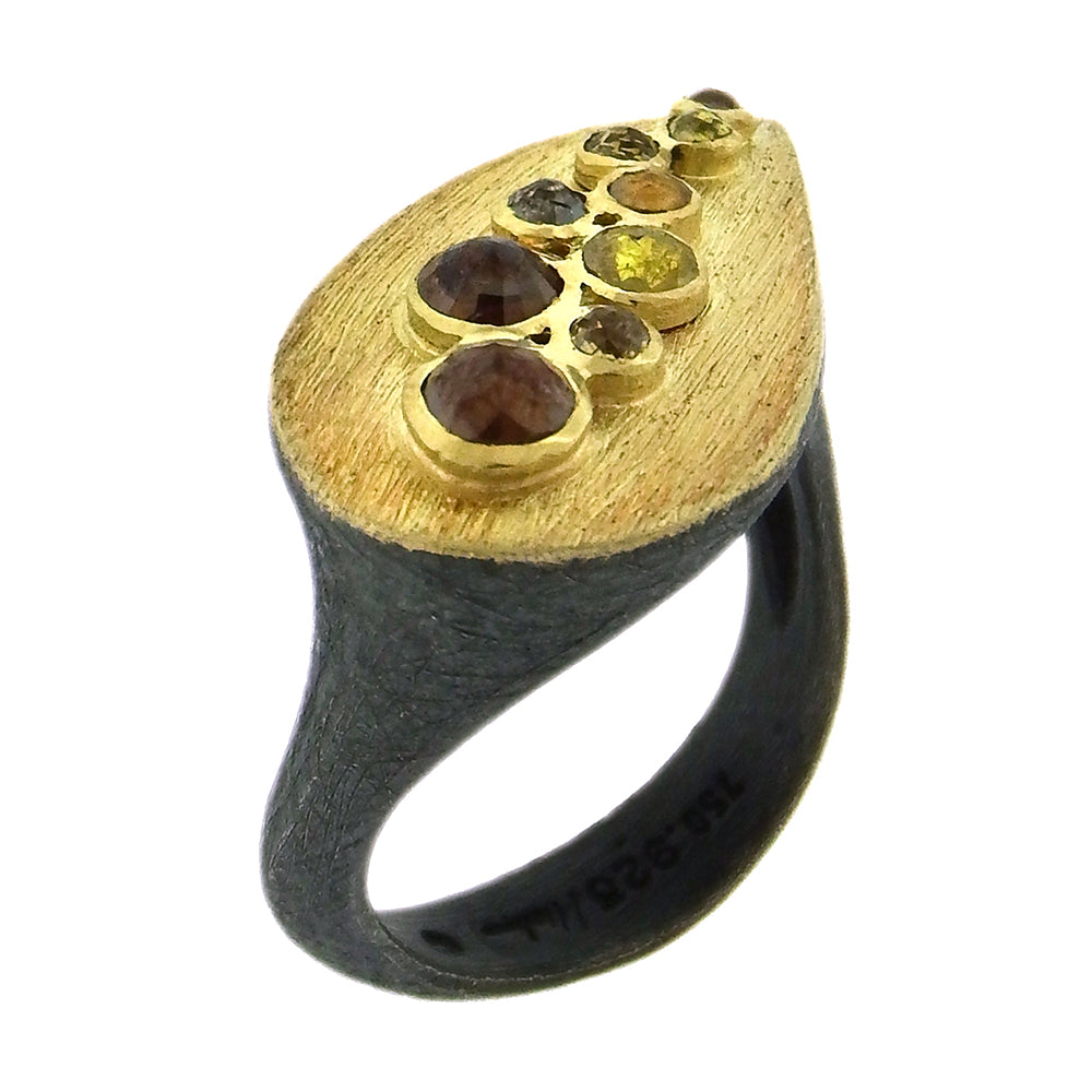 Alishan sets 0.96 cts natural rose-cut champagne and brown diamonds in his asymmetrical teardrop ring, 18K gold and oxidized sterling silver. The ring measures 1" x 1/2" at the widest x 1/4".