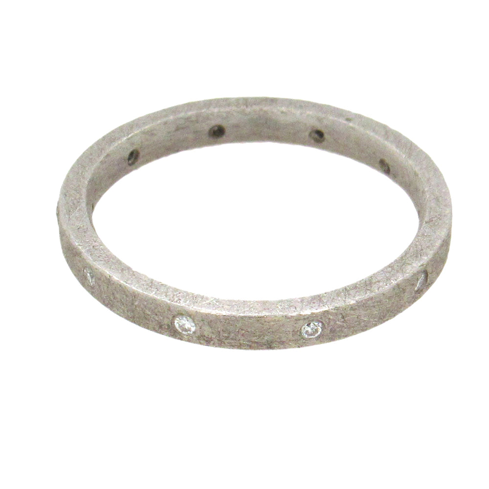 Alishan's new series of rose-cut and raw diamond engagement rings are fresh, young and very modern. Here, he sets a 1.40 carat rose-cut salt-and-pepper diamond in 18K rose gold, with a matte-finish palladium band accented with two small diamonds. The companion band is set with 10 small diamonds, 0.07 cts, to catch the light. Can be purchased separately.