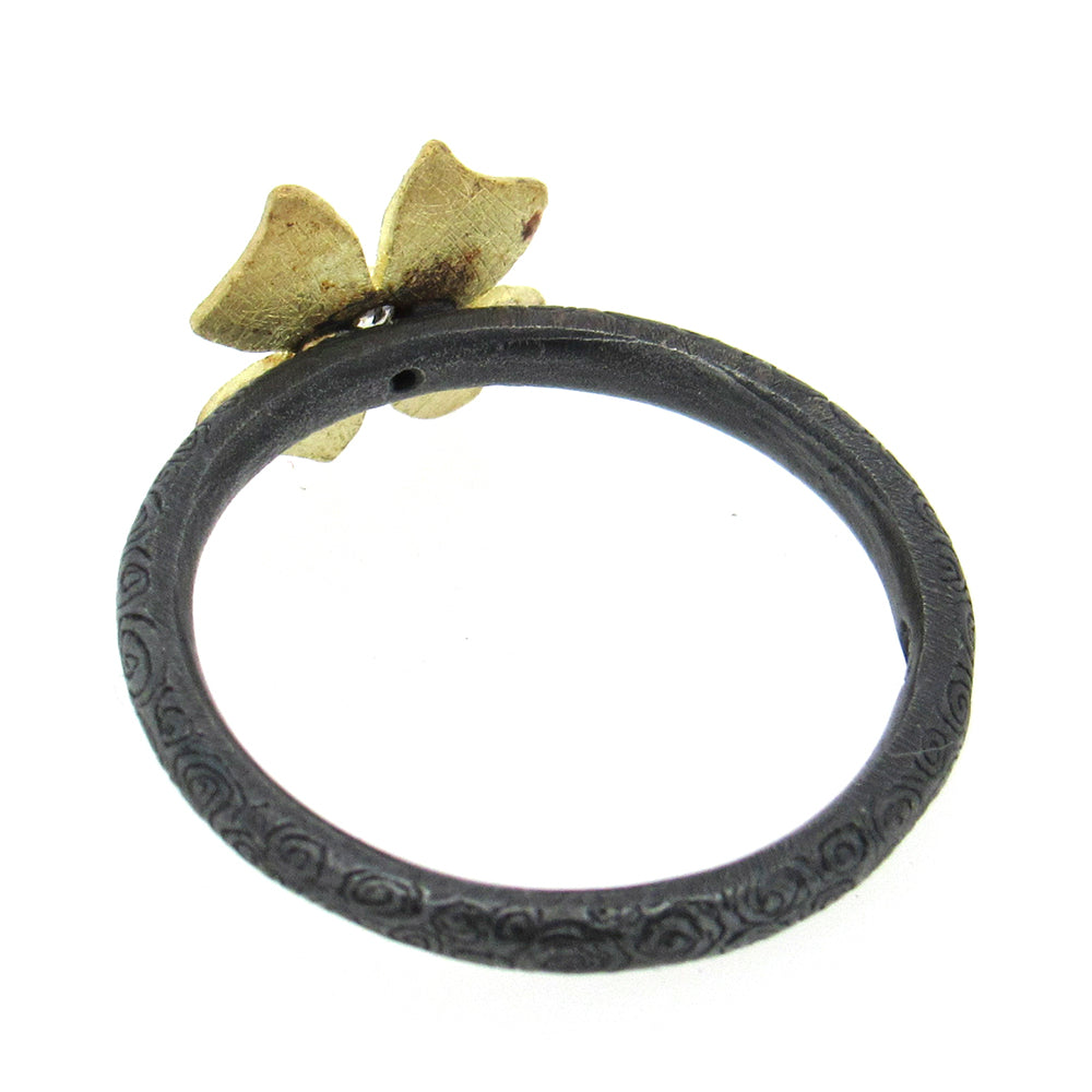 We love these petite gold, diamond and sterling petal rings by Alishan, this one a single 18k yellow gold flower set at center with a white diamond, 0.03 tw, on an oxidized sterling band.