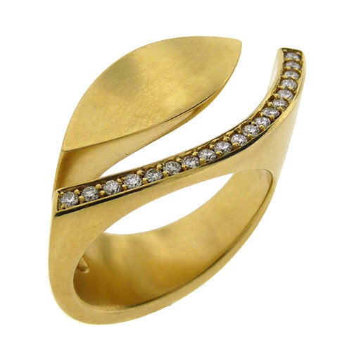 Angela Hubel's 'Diamond Eye' sculptural ring curves along the finger when worn, the two elements -- diamond pavé crescent, 0.27 cts, and 18K navette shape eye -- float next to each other separated by a curve of negative space and the hand. Hubel designs rings so meticulously that this one is made for the left hand -- and can be ordered for the right hand -- or worn on the middle finger on either hand. 1-1/4" x 5/8".