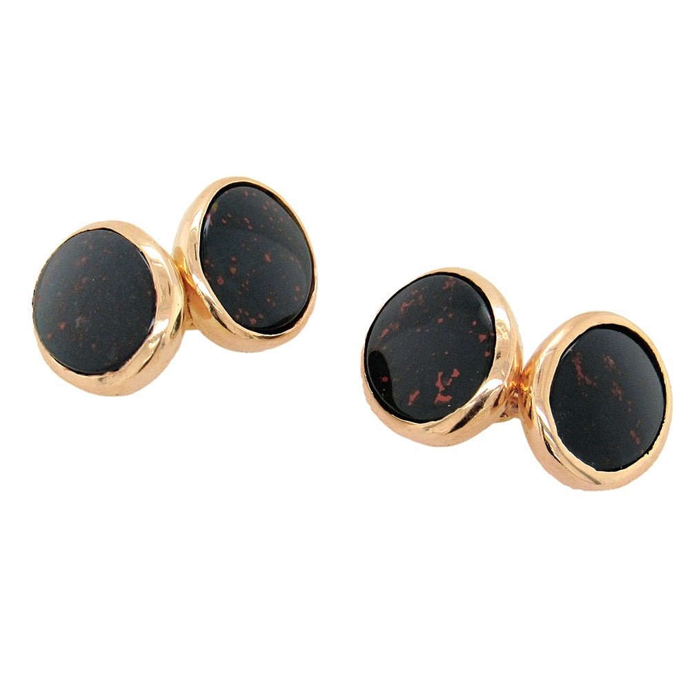 Oval antique bloodstone cufflinks set in 18K gold measure 3/8" x 5/8".