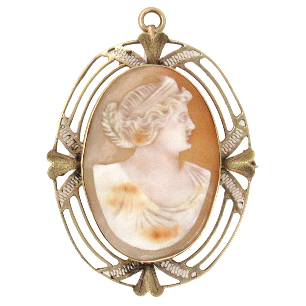 Oval shell cameo pin/pendant depicts a classical profile adorned with a tiara and feather in the hair, set in 10K gold triple wire frame with trumpet lily forms on four sides. The cameo measures 1-1/4" x 1-1/2", with pinback and folding pendant loop.