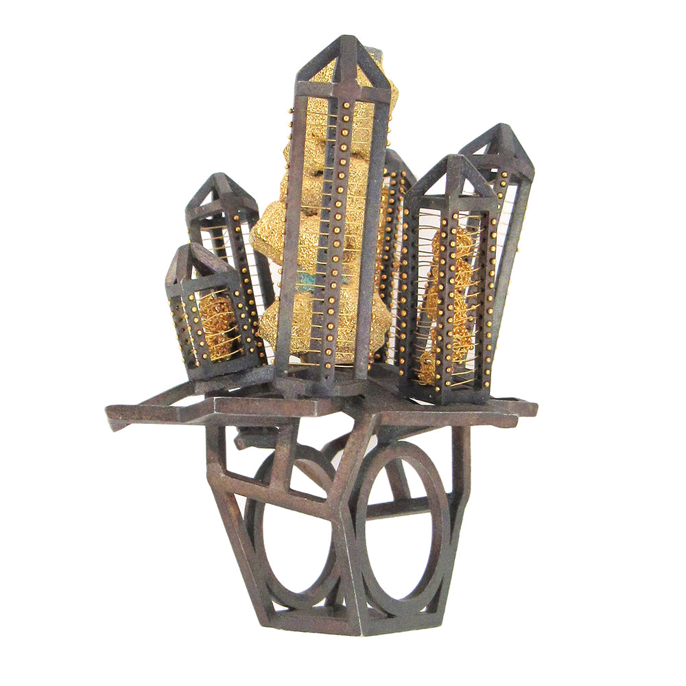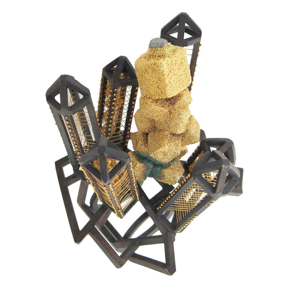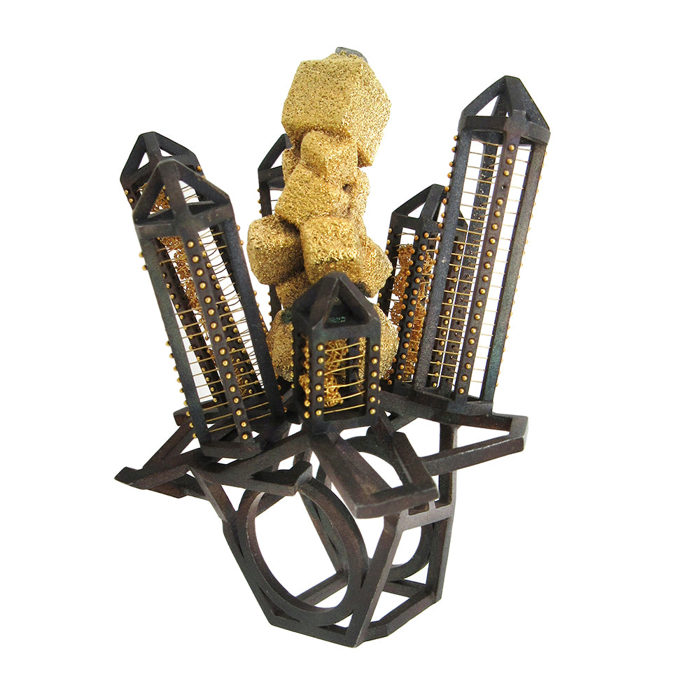 Arata Fuchi's 'Solarity' sculpture and ring is a tour de force of imagination and metal work, the miniature City of Light rising from an open architectural structure of sterling silver, delicate 24k gold wired towers open or filled with 24K gold encrusted cubes, with center cubic sculpture. The piece measures 2" x 1-3/4" x 2-5/8" above the hand. Ring is size 7.