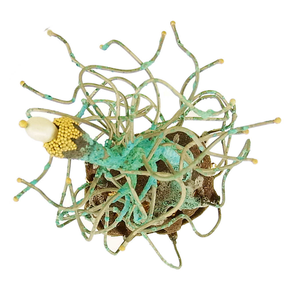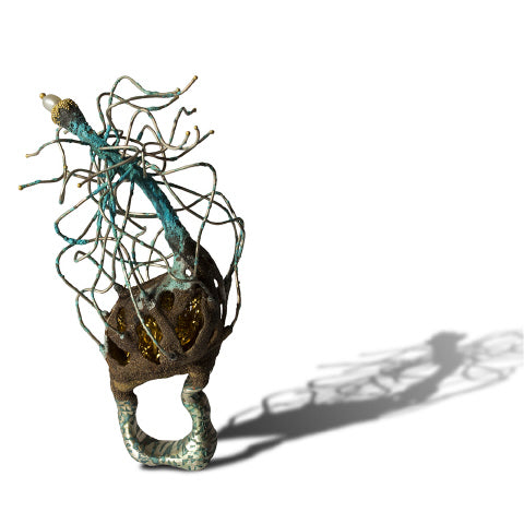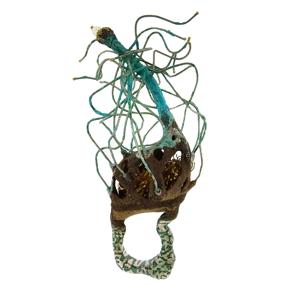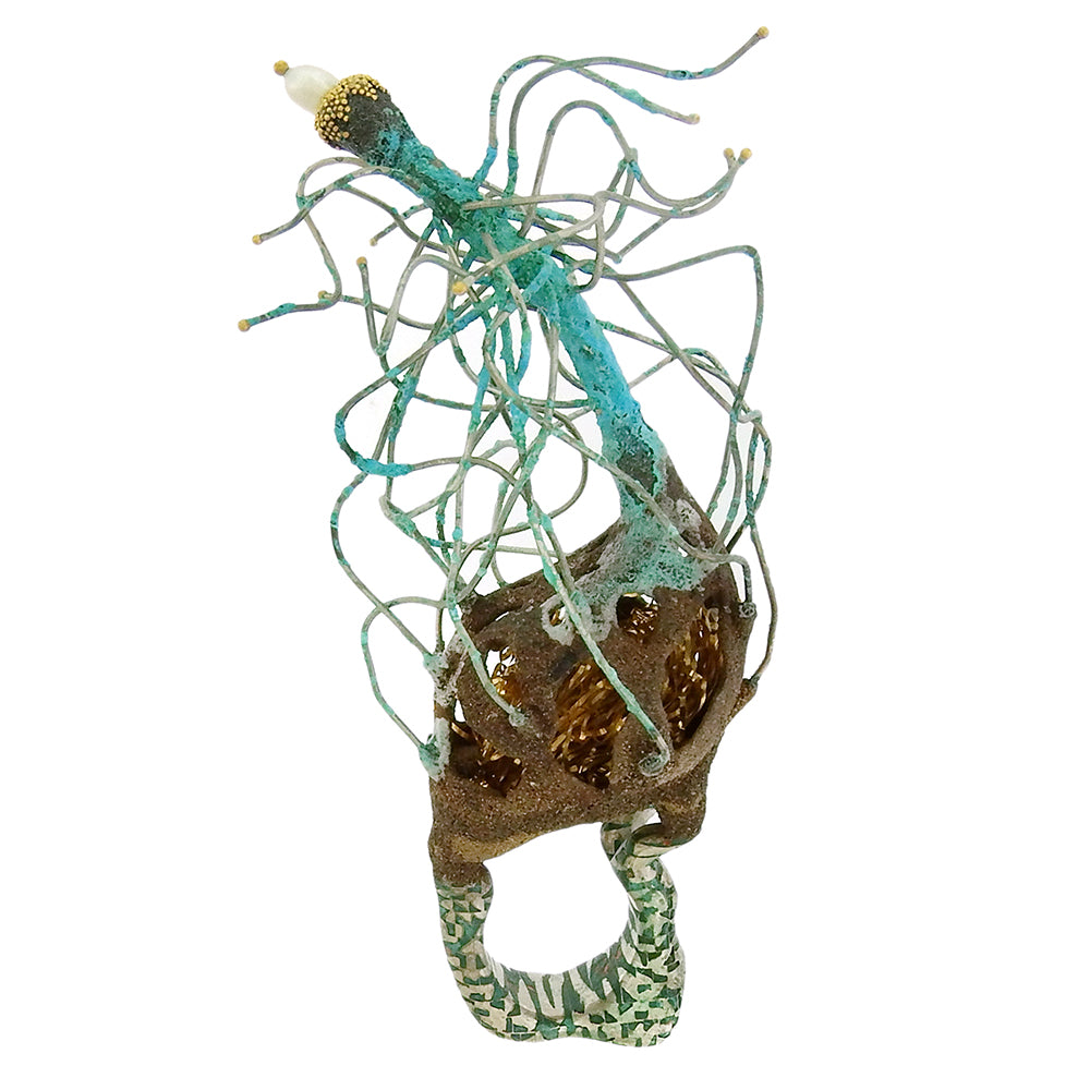 Arata Fuchi's 'Surge of Emotion1" is a remarkable sculpture to wear,the soaring tendrils of silver and patinated metal rising from a ring shank of silver and copper,the darker textured shibuichi metal pierced to reveal 24K gold shreds. The sculpture/ring measures 2" x 1-3/8" x 4-3/4".