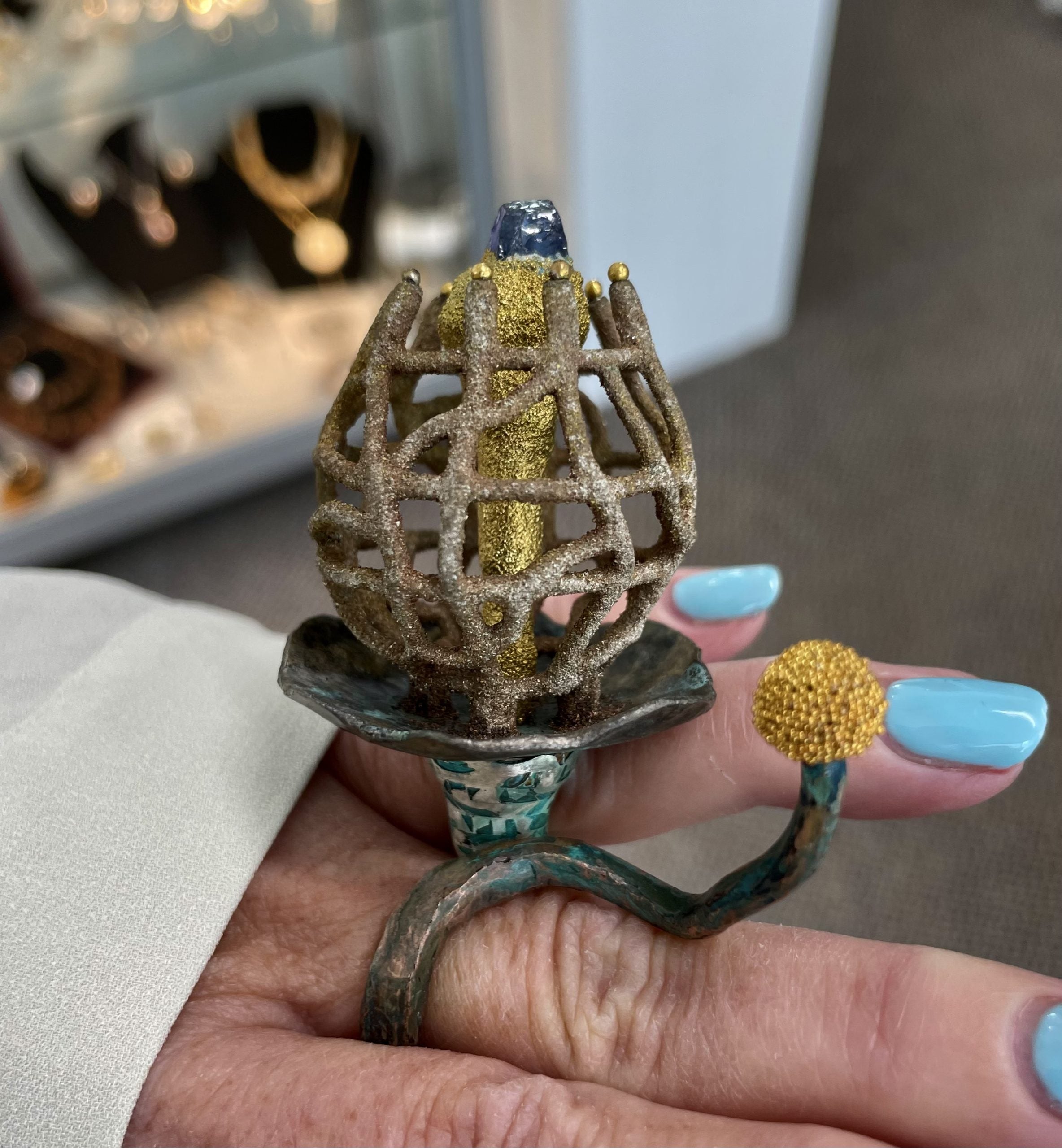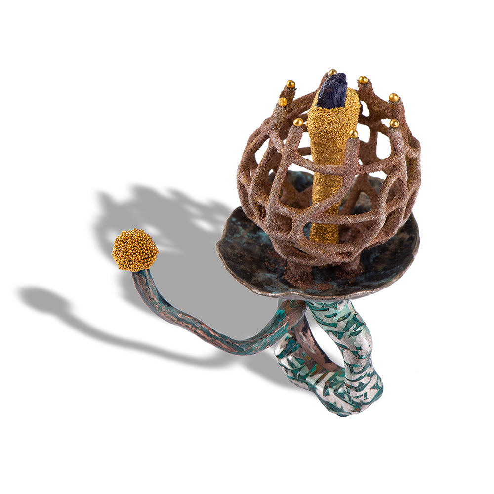Arata Fuchi's Utakata1 ring sculpture is a tour-de-force of Fuchi's bold and uncompromising vision. His metal art is visually engaging at every level– form, concept, material and technique. Here, his ring sculpture constructed of bronze, iron, shakudo, mokumegane, silver pulverization, pure gold granules and a tanzanite crystal at top. The ring measures 1-3/4" x 2-1/4" x 3" h.