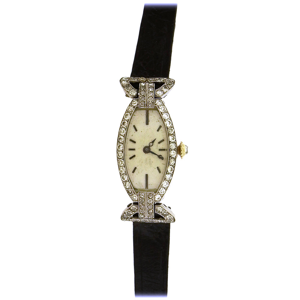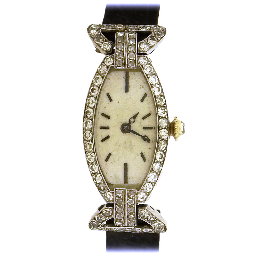 Art Deco platinum and diamond rare Cartier,No. 11476/20148, the movement by European Watch & Clock Co., Inc, made circa 1915. Very fine and very rare, Art Deco, tonneau-shaped, platinum and rose-cut diamond-set women's wristwatch, 15mm x 36.5mm, with hinged bow-shape extended diamond-set lugs and rose-cut diamond crown. The manual wind movement is warrantied by Aaron Faber for 2 years.
