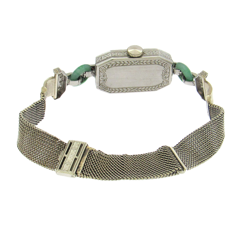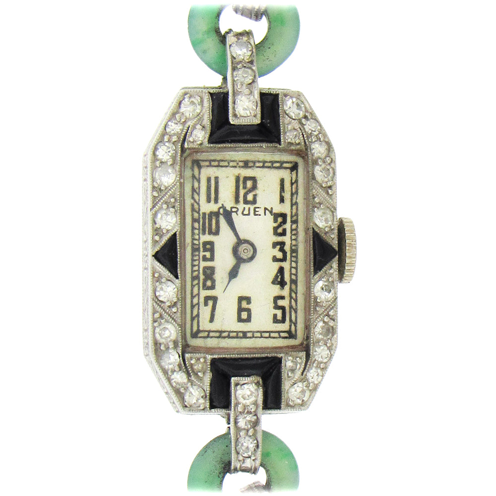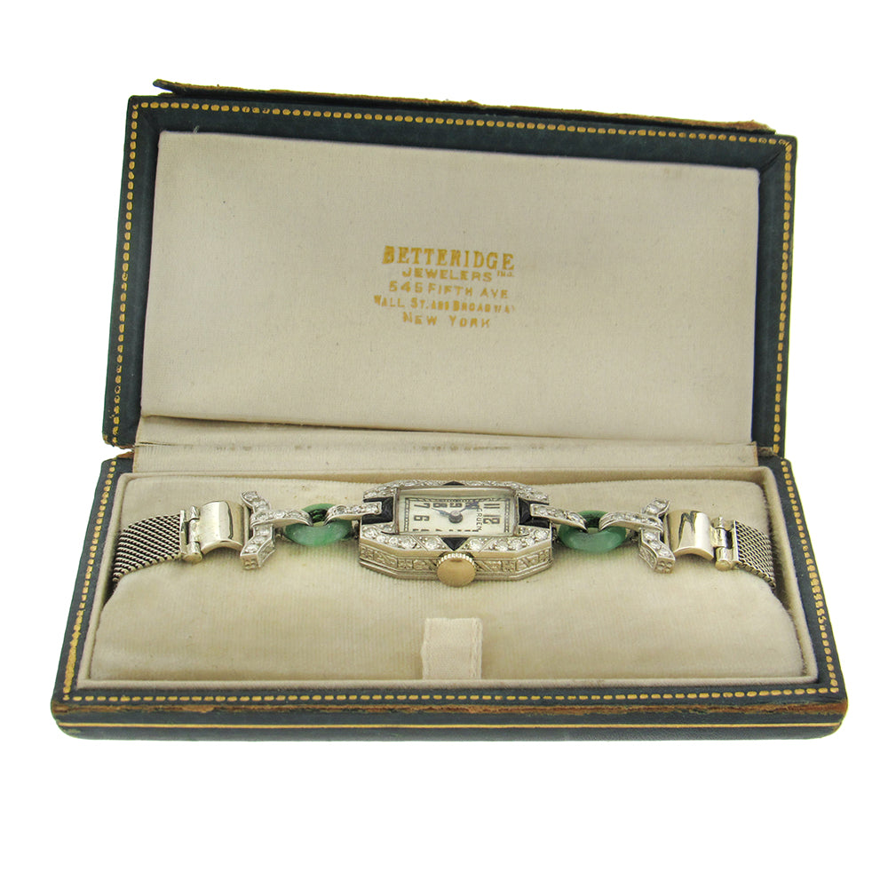 A remarkable find! Early women's Art Deco Gruen evening wristwatch, circa 1930, features a 14mm x 25mm hinged platinum case with decorative engraving, 18K white gold mesh bracelet with diamond-set clasp, inlay onyx and diamond bezel and extended lugs and green jade circle links. In Betteridge box, apparently from the period, citing Betteridge history "In the early twentieth century, Betteridge flourished, opening fine jewelry stores on two of the most important corners of New York City; Fifth avenue & 45th Street and Wall Street & Broadway. Betteridge produced some of the preeminent Art Deco designs of the period, which still turn up in fine jewelry collections." The 17 jewel movement is warrantied by Aaron Faber for 2 years.