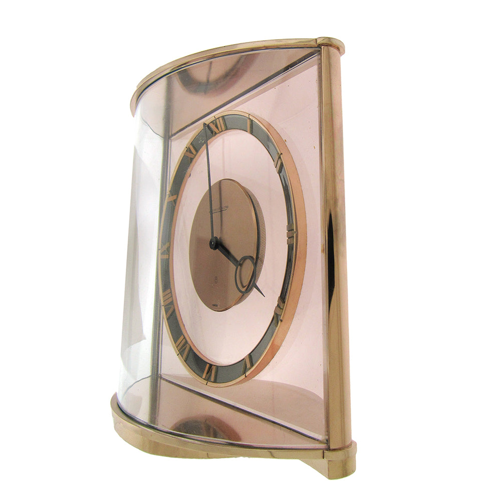 We love this 1950's stylized Modernist desk clock by LeCoultre with its curving lines and rose gold plate on brass finish. The clock measures 6-1/2" x 6-1/4" x 4-1/2". The manual wind movement is warrantied by Aaron Faber for 1 year.