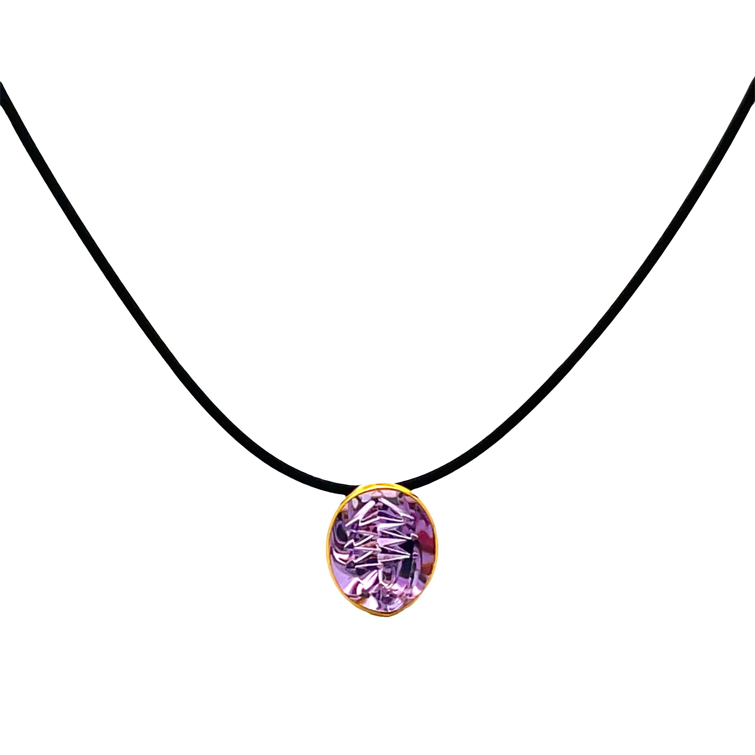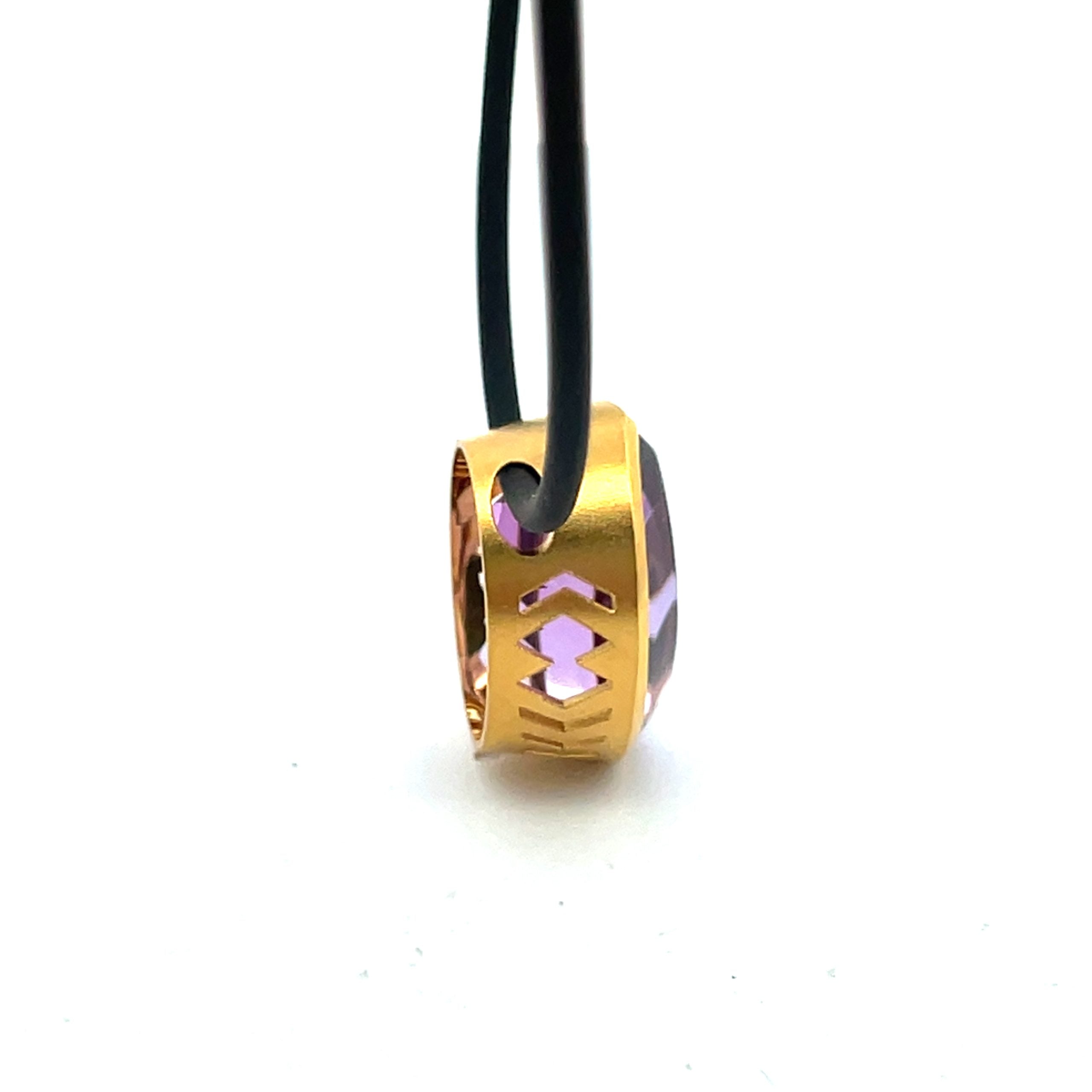 The 'Dragon's Egg' is one of our favorite new gem cuts from the Munsteiner studio from Philipp Munsteiner, reflecting and refracting amethyst's iconic color in this 19.53 oval set in 18K yellow gold with a 20" silicone cord with 18K safety clasp. The amethyst pendant measures 5/8" x 3/4". Accompanied by Munsteiner certificate.