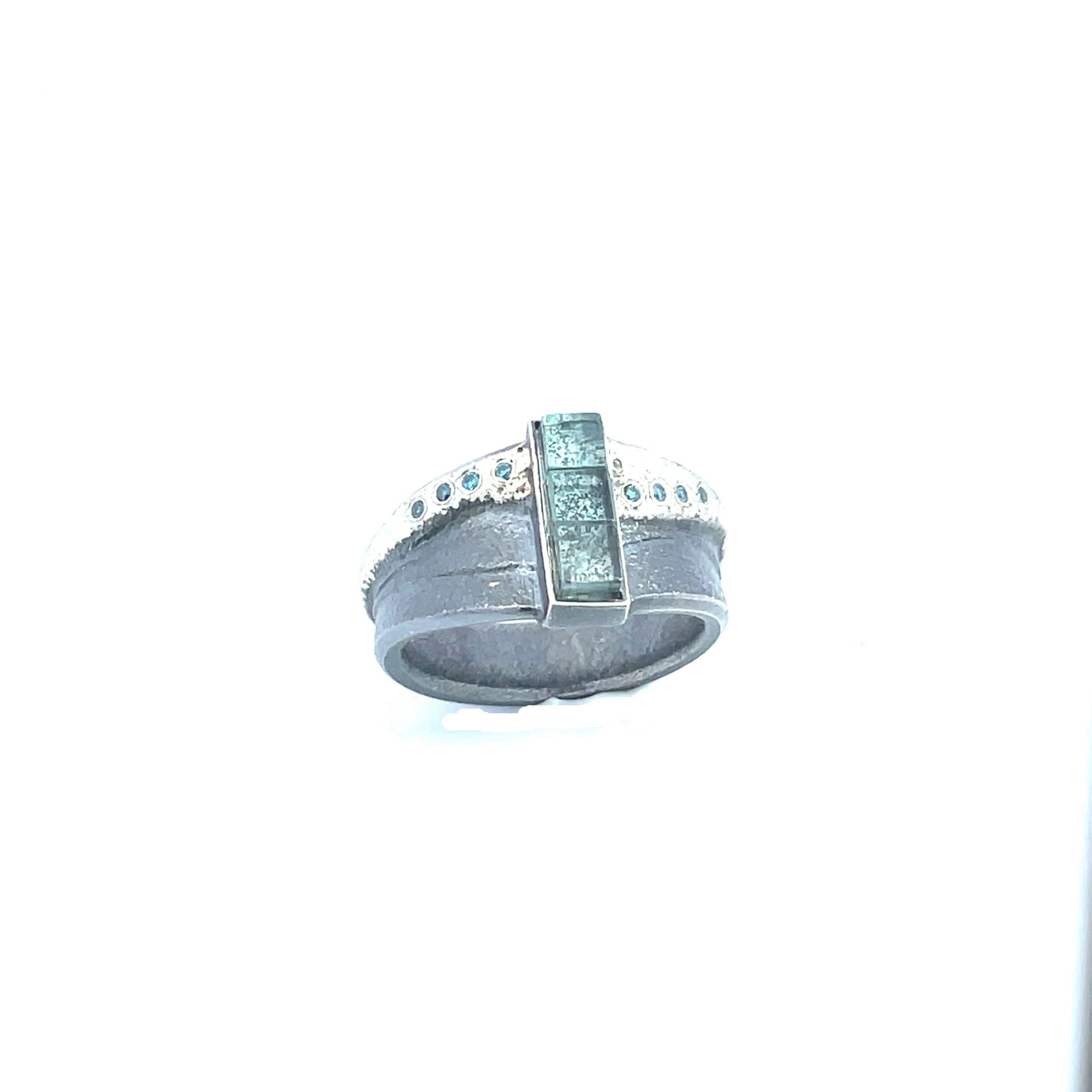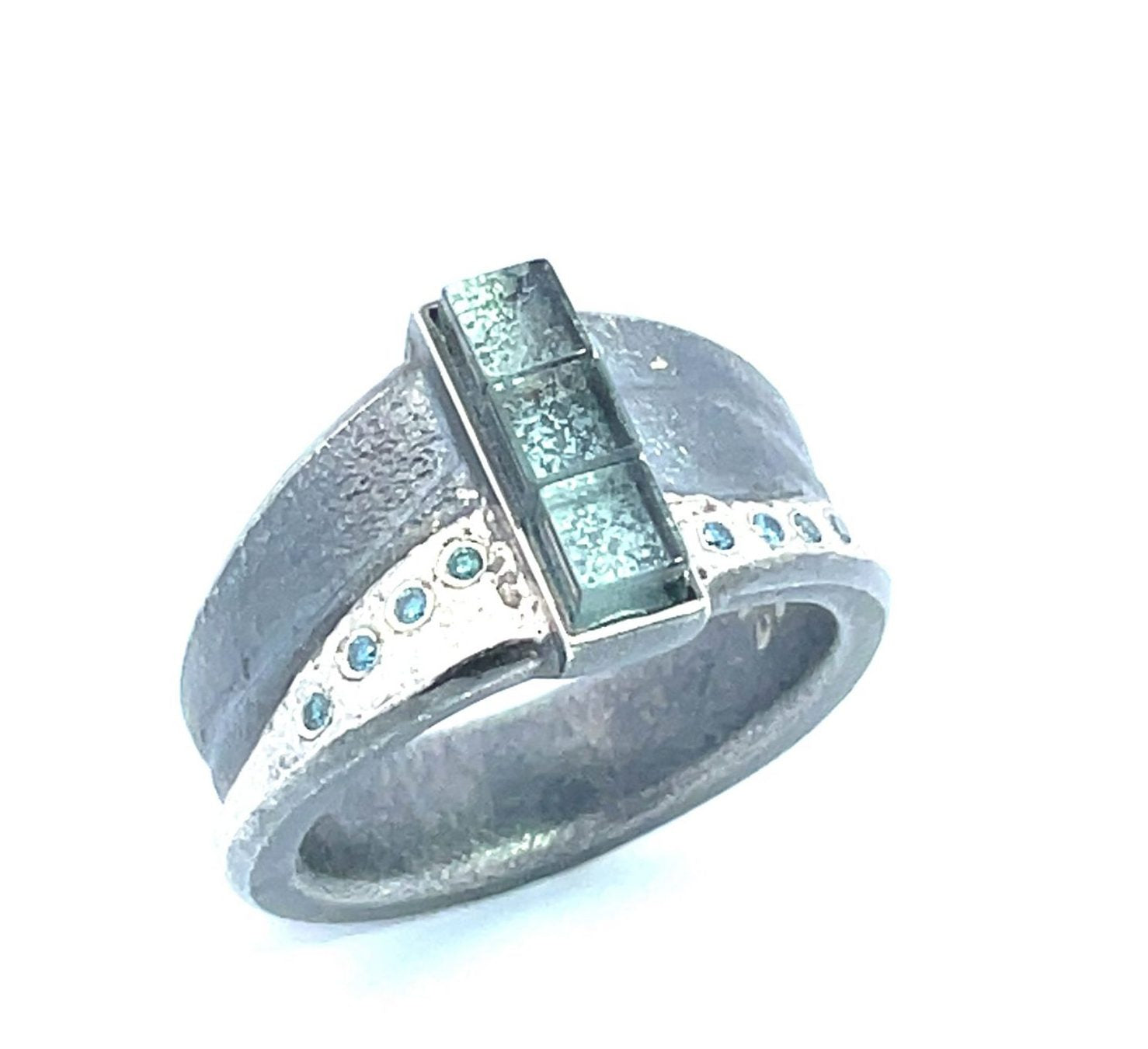 A favorite men's ring: Peter Schmid's cigar band style ring in oxidized sterling, set with 0.08 cts blue (enhanced) diamonds in a bright gold strip, set with three perfect aquamarine cubes, 2.70 ts tw. The ring measures 7/8" x 1/2" and is size 9-3/4.