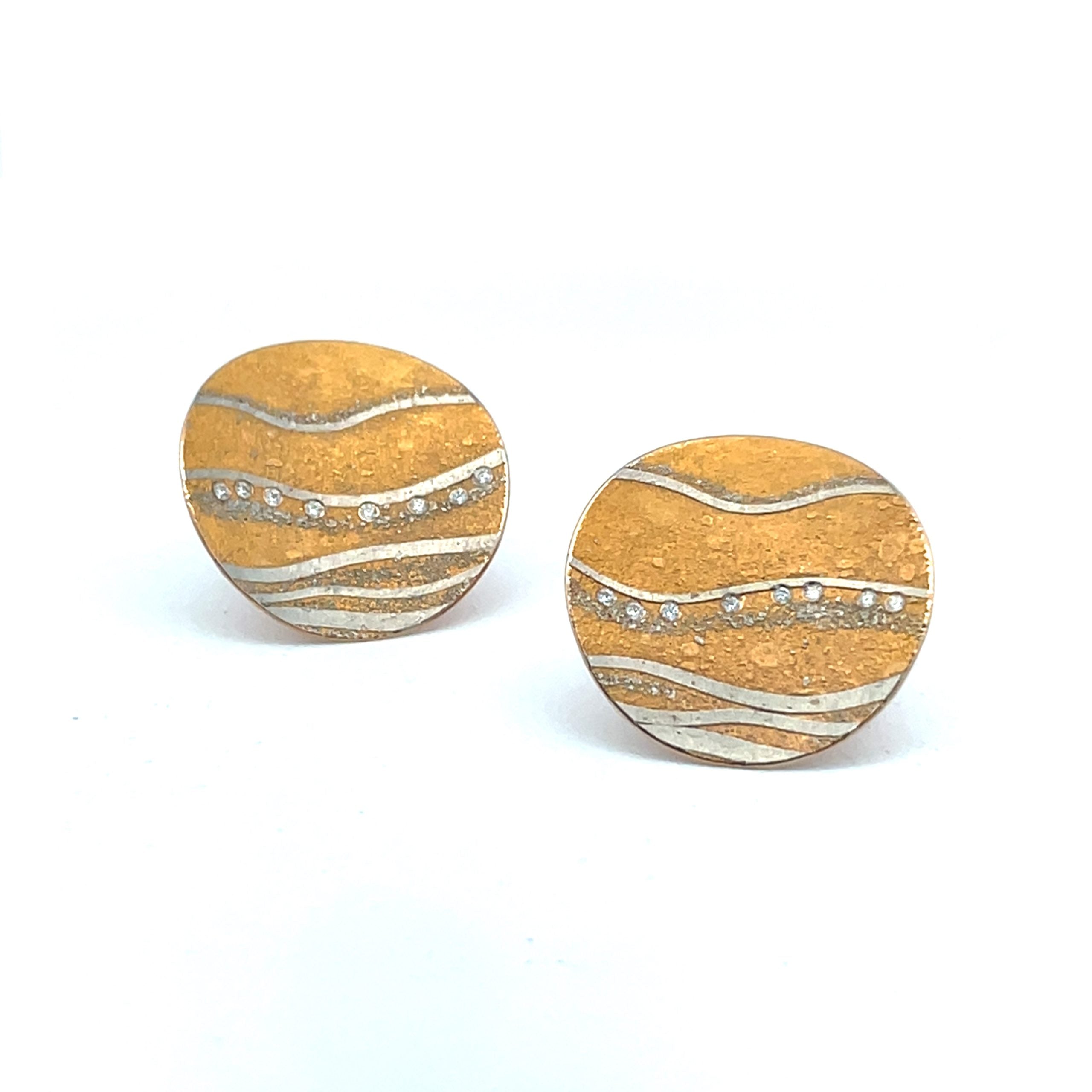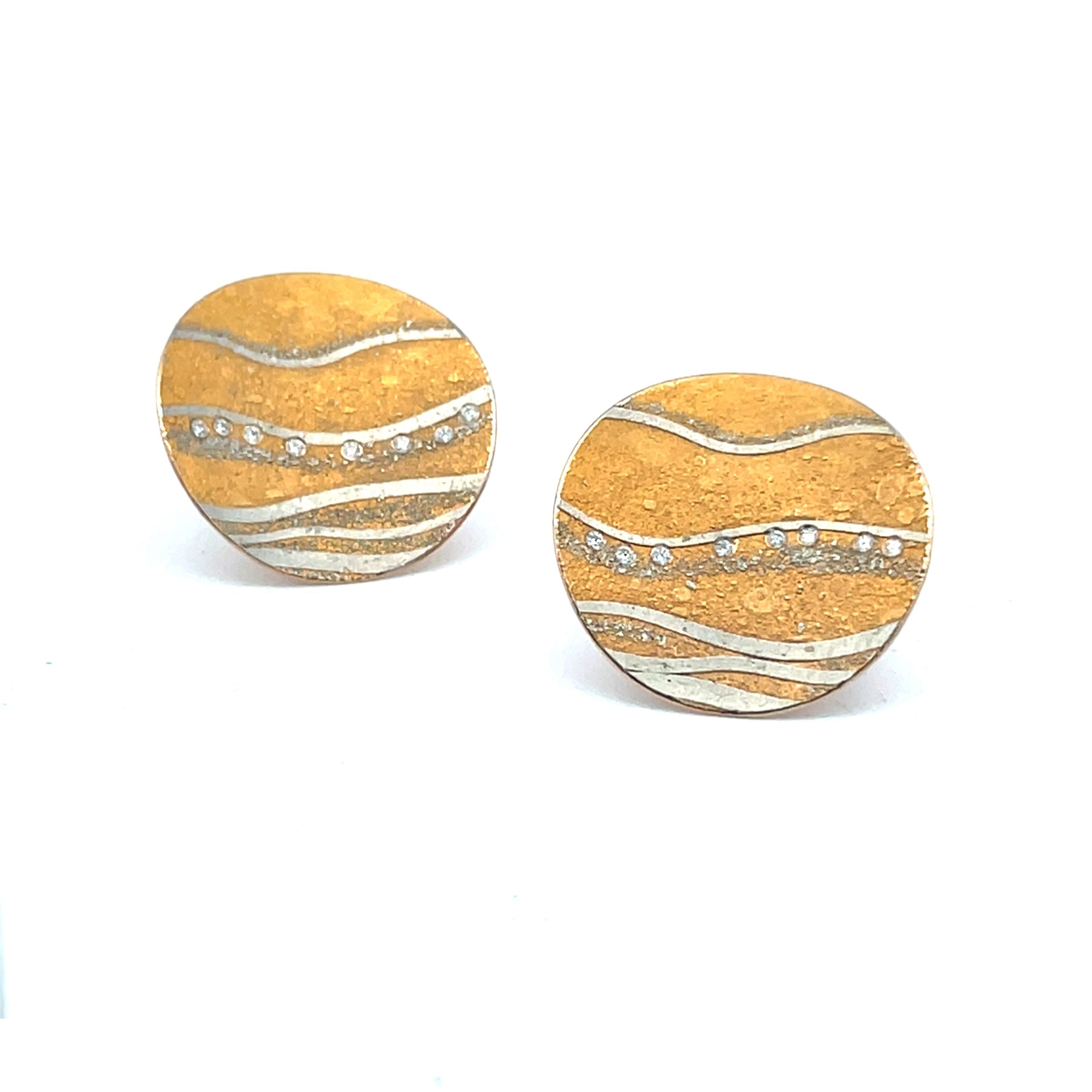 The heavenly art of Atelier Zobel shines in these abstract curved disc earrings, 18K yellow gold with waves of platinum and diamonds, and a 24K gold stardust texture. 1-1/16" in diameter, 18K gold post and clip back, 0.16 cts tw diamonds.